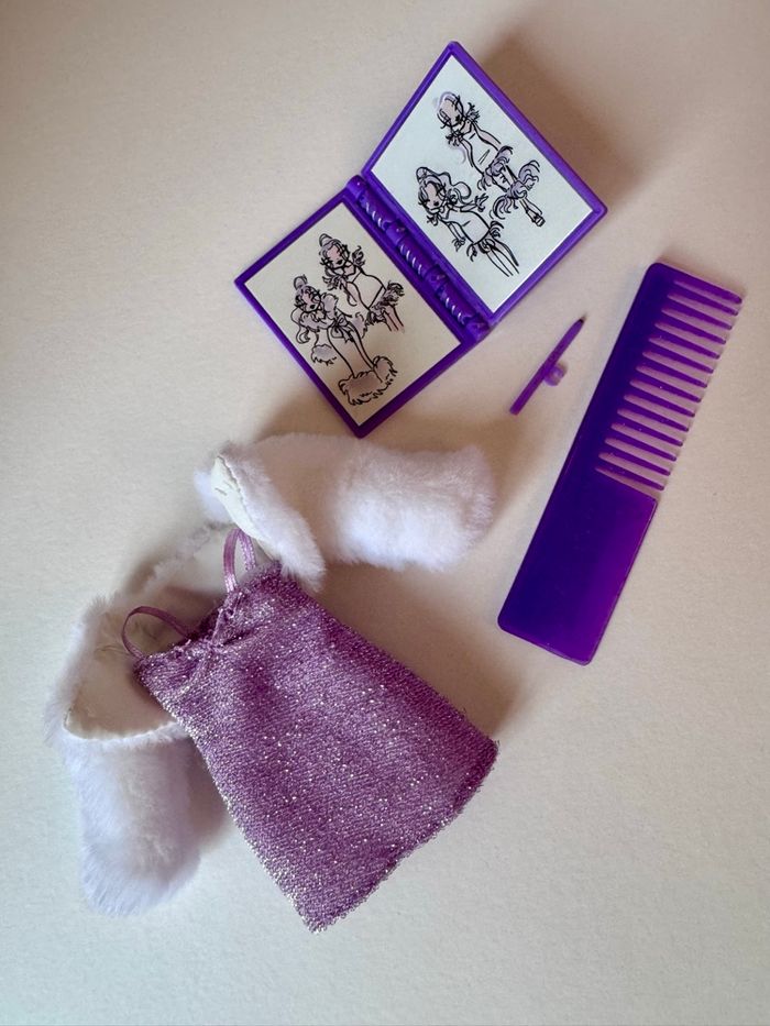 Non jouée, juste exposée. Les cheveux ont été lavés pour retirer le gel coiffant, ils sont doux et démêlés. Boucles d’oreilles en métal. Le portant présentant la deuxième tenue n’est pas inclu ! Maison non fumeur, envoi rapide et soigné