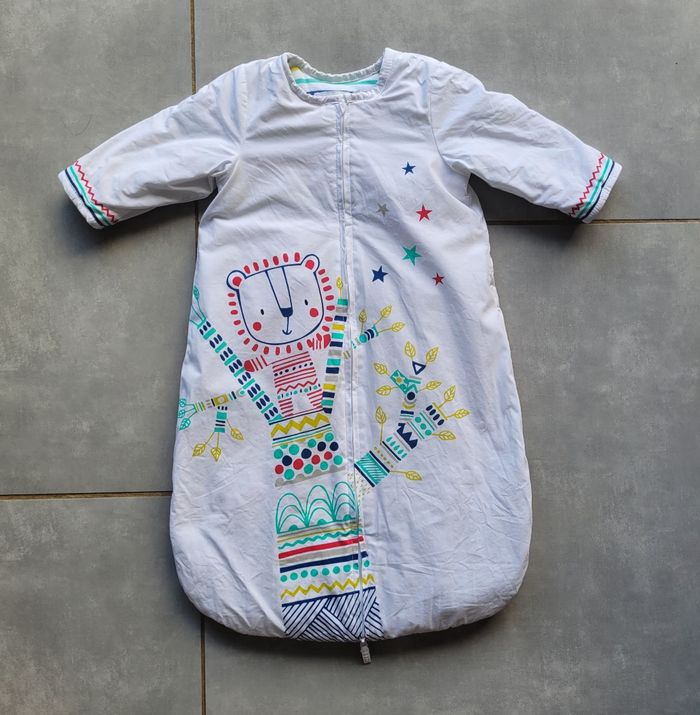Gigoteuse de couleur blanche avec motif multicolore, ouverture sur le devant par fermeture éclair, de la marque Prémaman, taille 1 (70 cm, de la naissance à 6 mois), neuve, l'étiquette à été coupée pour le lavage. Article lavé pour la vente.