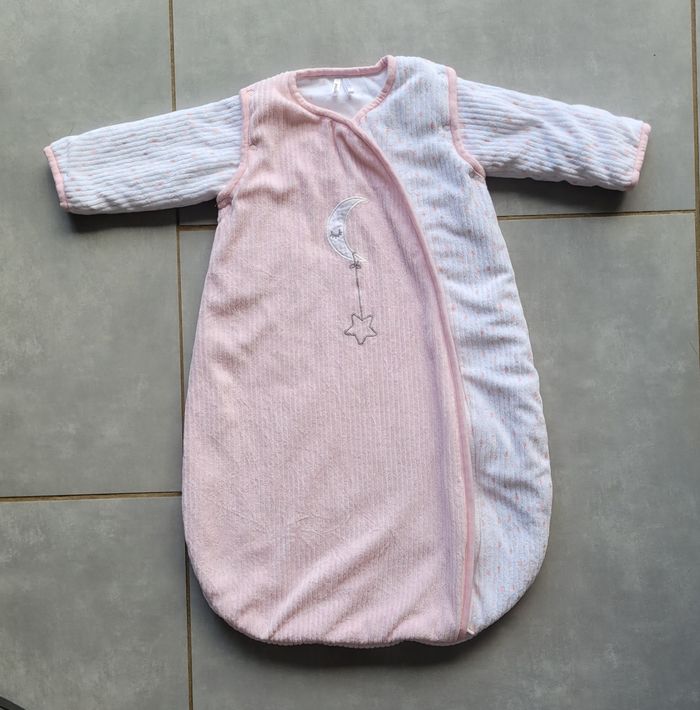 Gigoteuse de couleur blanche et rose, en velours, manches amovibles, ouverture sur le devant par fermeture éclair, de la marque Orchestra, taille 1 (50/67 cm, de la naissance à 6 mois), en très bon état. Article lavé pour la vente.