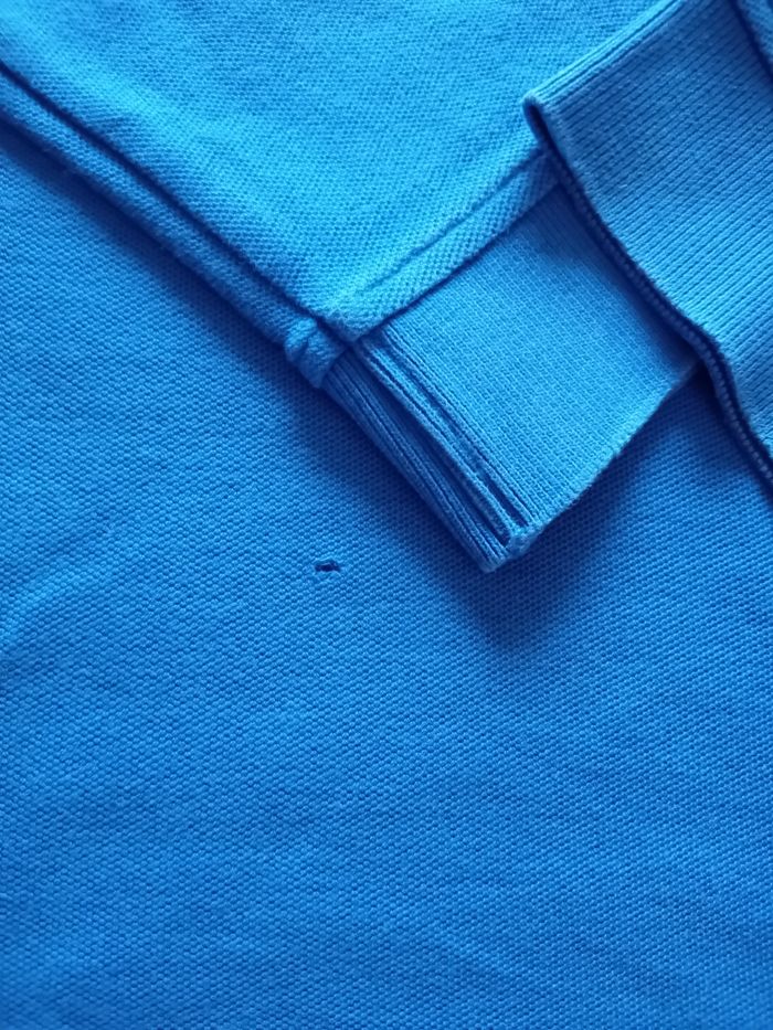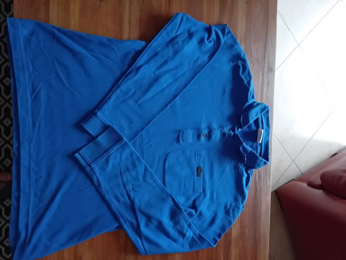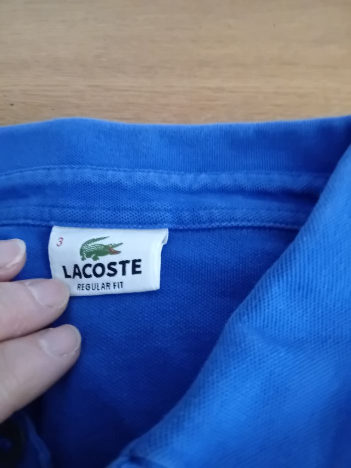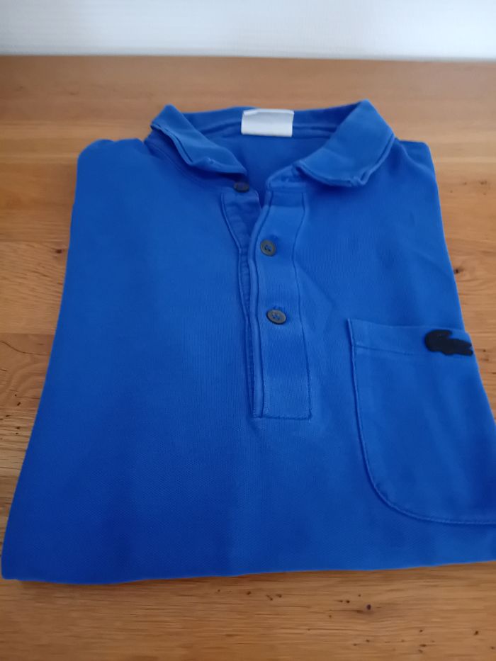 Polo Lacoste homme taille S bleu à manches longues en bon état général. Un mini trou visible sur l une des photos. Bleu légèrement délavé.
