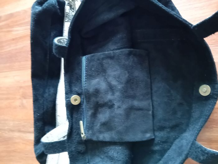 Sac cabas fourre tout style Vanessa Bruno noir en daim en bon état général. Lanières un peu usagées et petite fermeture intérieure qui ne fonctionne pas.
