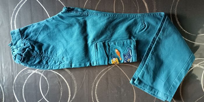 Pantalon 100% coton bleu turquoise avec poches latérales au niveau de chaque cuisse dont une brodée avec motif poissons.