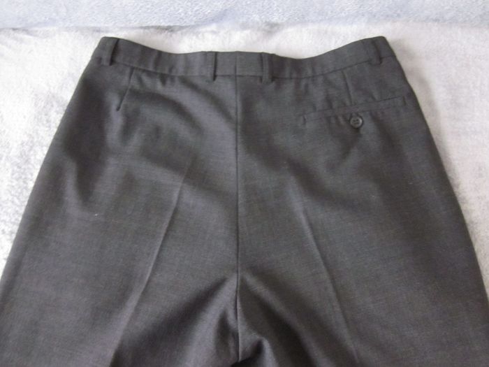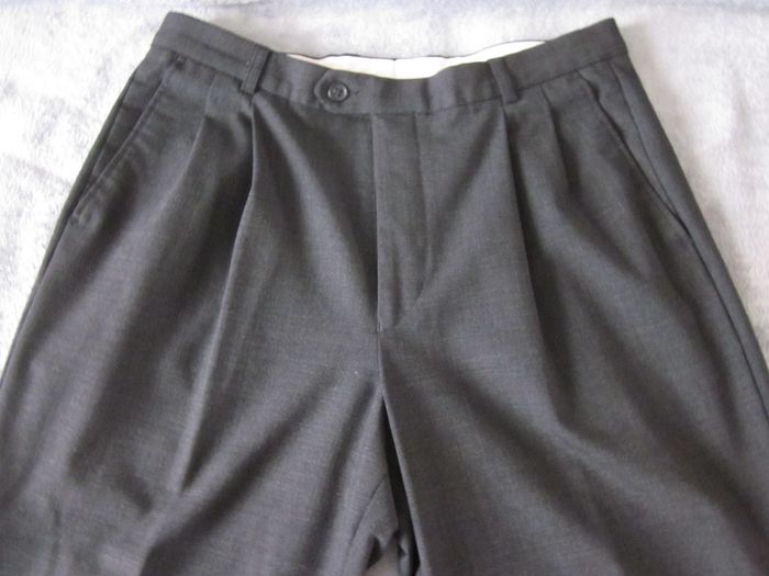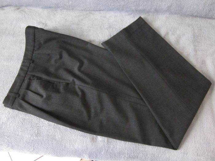 42, pantalon de costume, 43% laine, 2 poches latérales, 1 poche arrière, pinces, gris foncé
