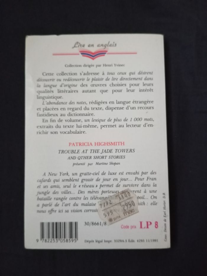 Je vends ce recueil de nouvelles "Trouble at the Jade Towers and Other Short Stories" de l'autrice Patricia Highsmith, en langue anglaise. - Titre : Trouble at the Jade Towers and Other Short Stories - Auteur : Patricia Highsmith - Éditeur : Lire en anglais - Langue : Anglais Bon état N'hésitez pas à me contacter pour plus d'informations !