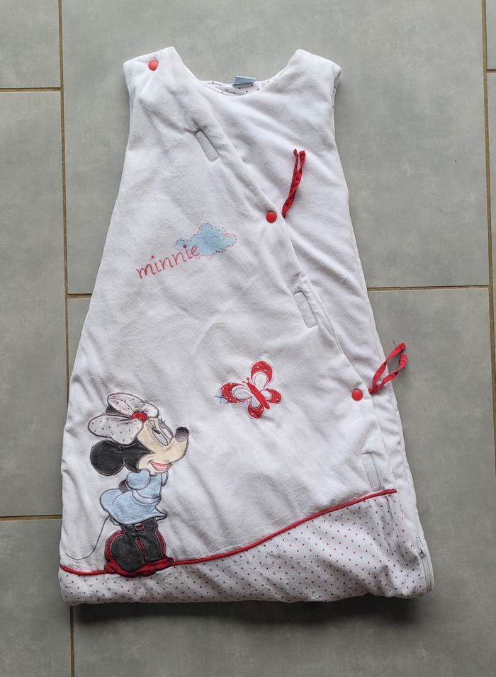 Gigoteuse chaude, dans les tons rouge et blanc, motif Minnie, de la marque Disney, taille 100 cm (correspond à 3/4 ans), en très bon état. Fermeture en bas par fermeture éclair, et sur le devant par pressions et scratchs, peut être rétrécie. Article lavé pour la vente.