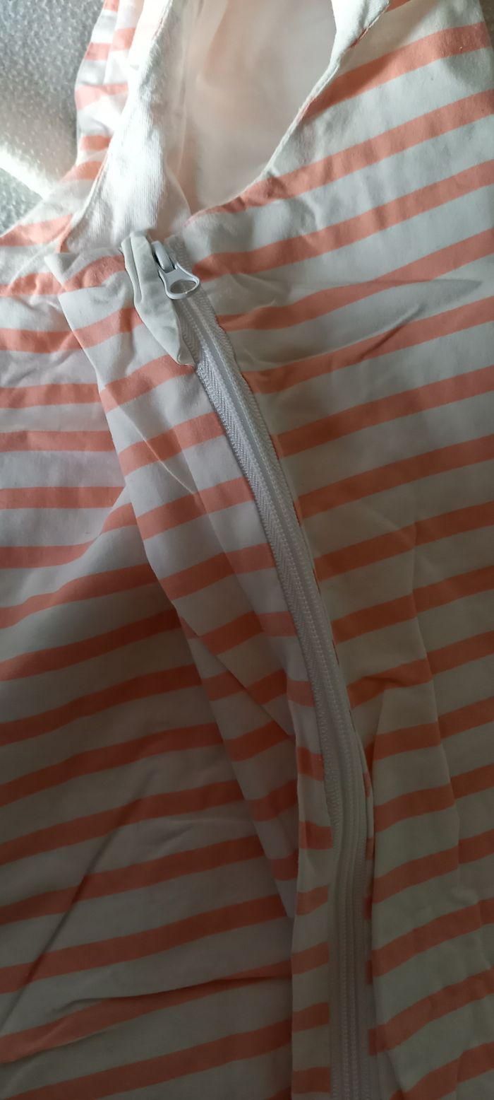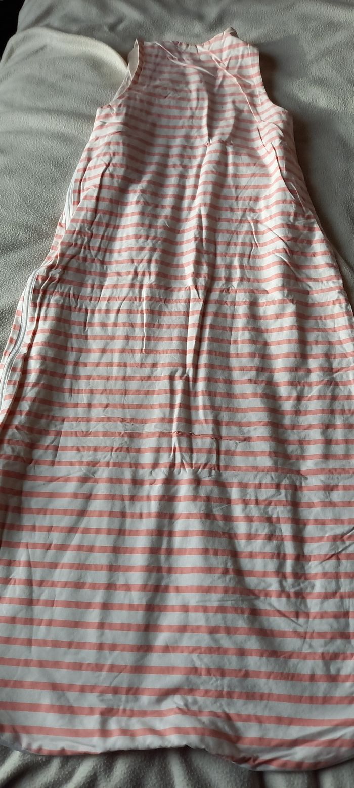 Gigoteuse été pour 18-36mois légèrement jauni a l encolure voir photo. Pressions sur les epaule et fermeture éclair sur tout le côté droit.