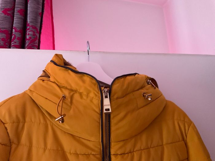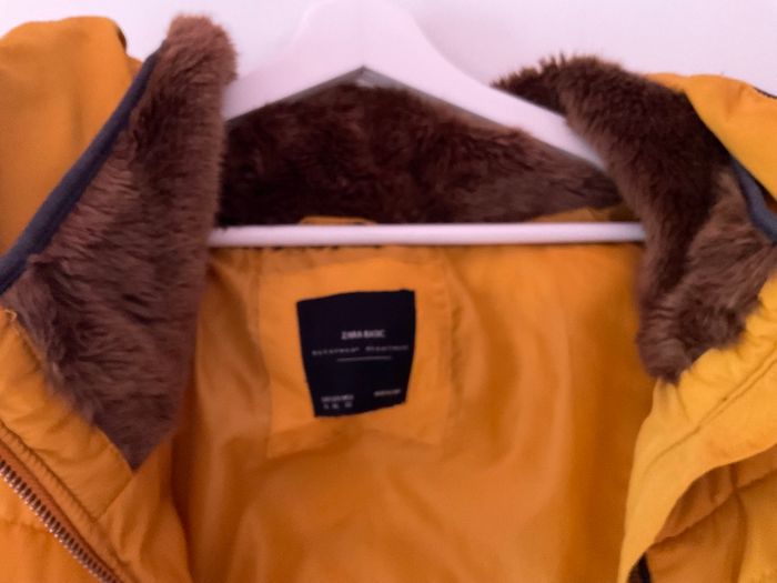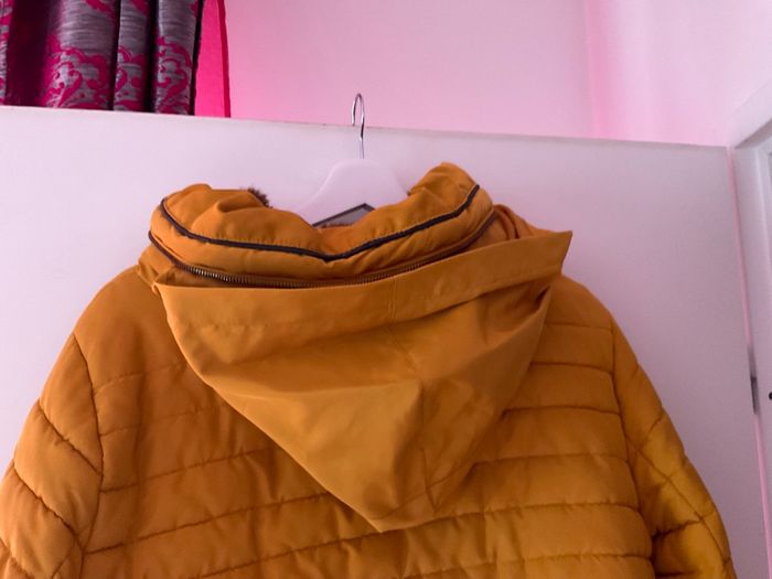 Doudoune Zara, couleur moutarde fourrure au col marron. La capuche se met à l'intérieur voir photo.