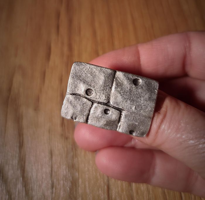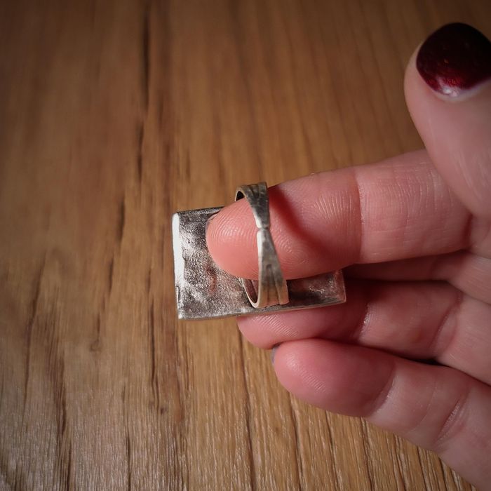 Bague de caractère au design géométrique composé de plaques rectangulaires en relief, ponctuées de petits rivets décoratifs. Finition patinée d’inspiration artisanale, avec une belle présence au doigt. Détails : • Plaqué argent, aspect vieilli • Très bon état, jamais portée • Bague ajustable • Dimensions : env. 3 × 2 cm Envoi rapide et soigné via Beebs.