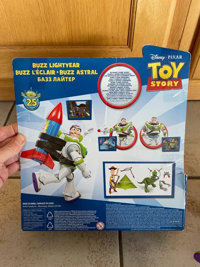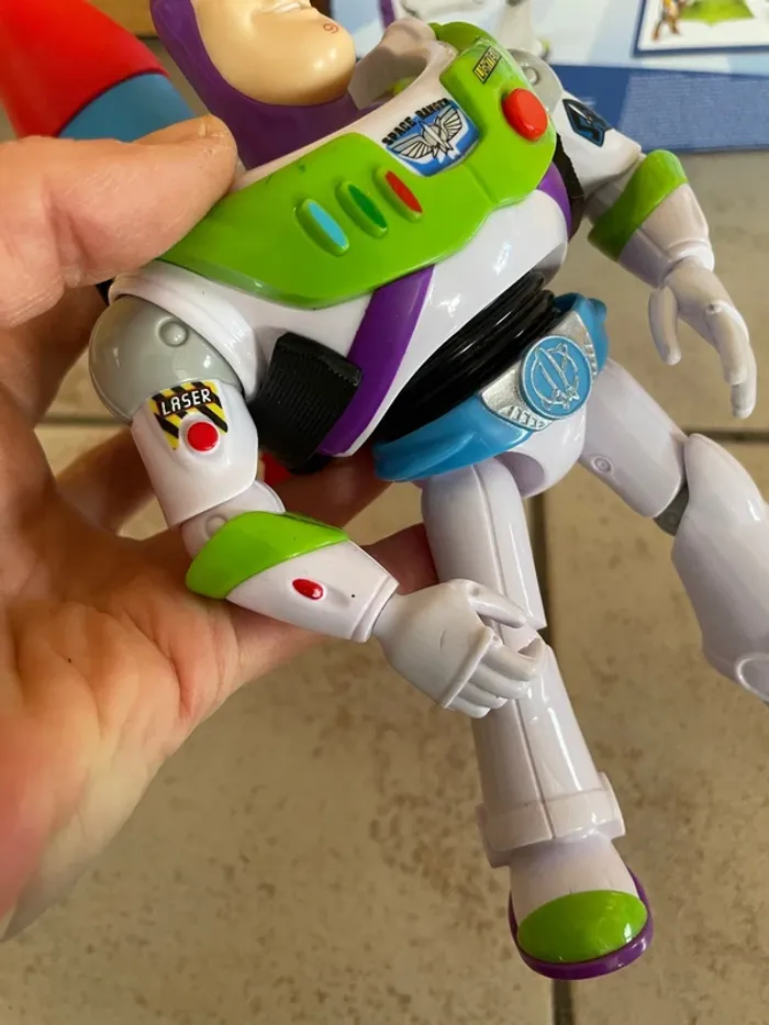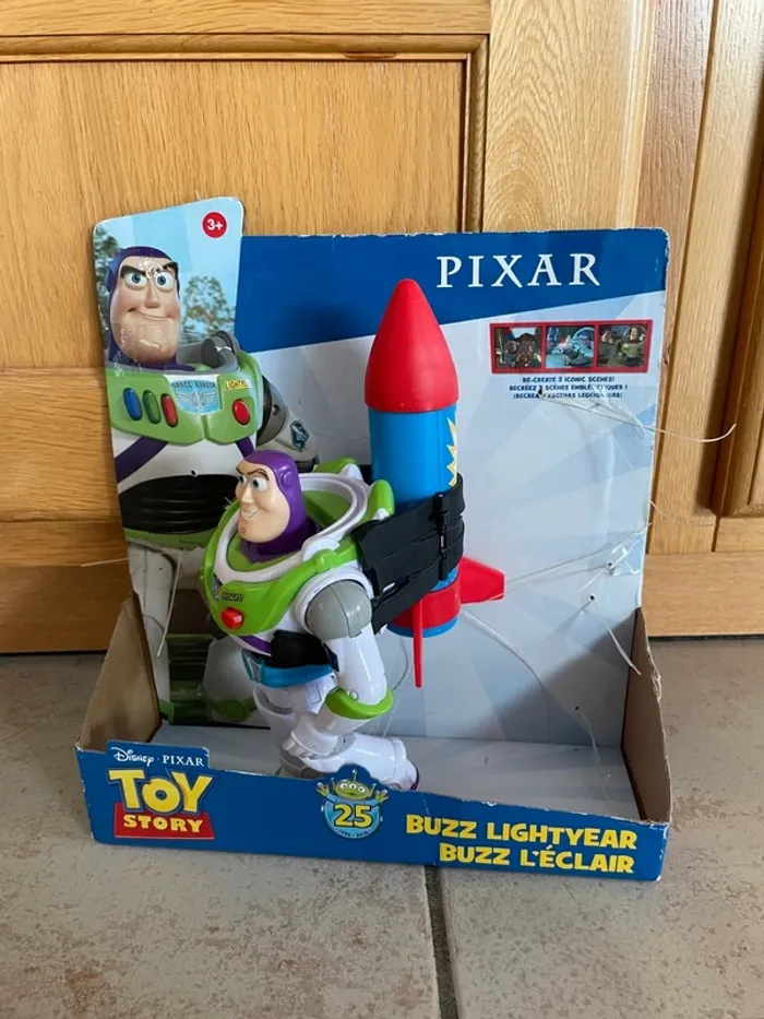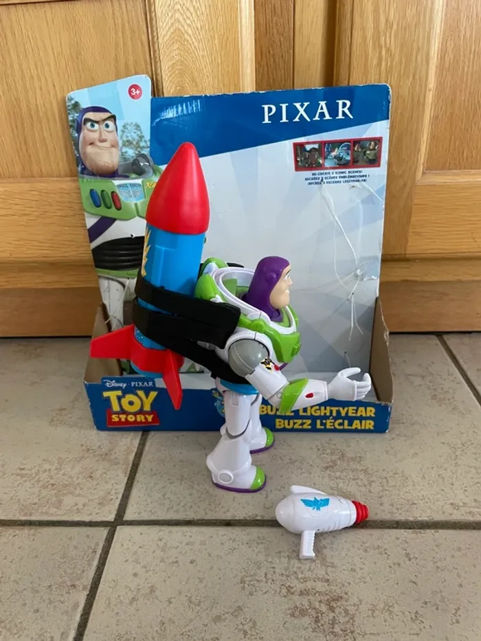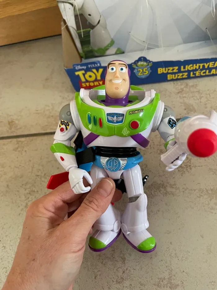 Buzz l'éclair (Buzz Lightyear) avec sa fusée accrochée dans le dos. Il a aussi un pistolet (sur certaines photos j'avais oublié de le mettre mais il bien fourni avec) Modèle GJH49 (non parlant) fabriqué pour le 25ième anniversaire. Acheté neuf et peu utilisé (traces d'utilisation possible mais minimes, voir photos) J'ai pas mal d'autres figurines de Toy Story et Buzz l'éclair dans mes annonces.