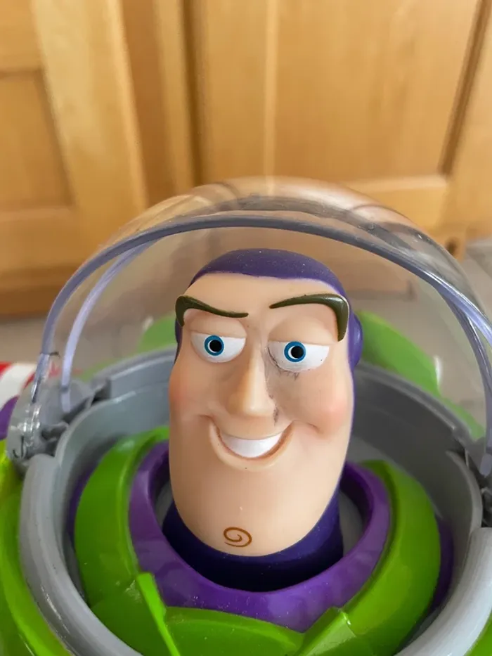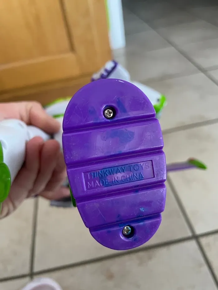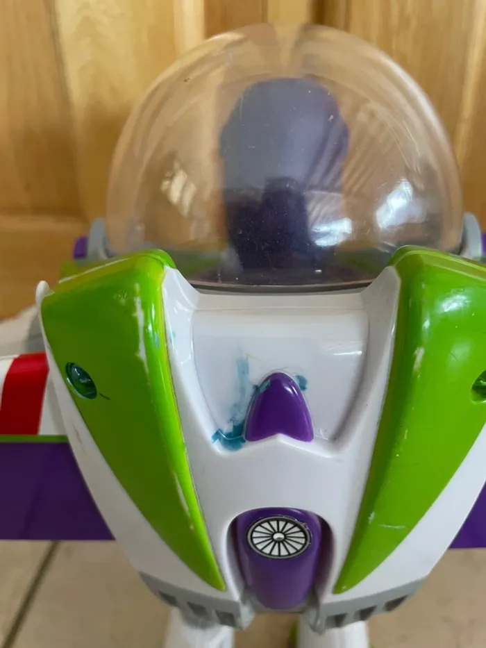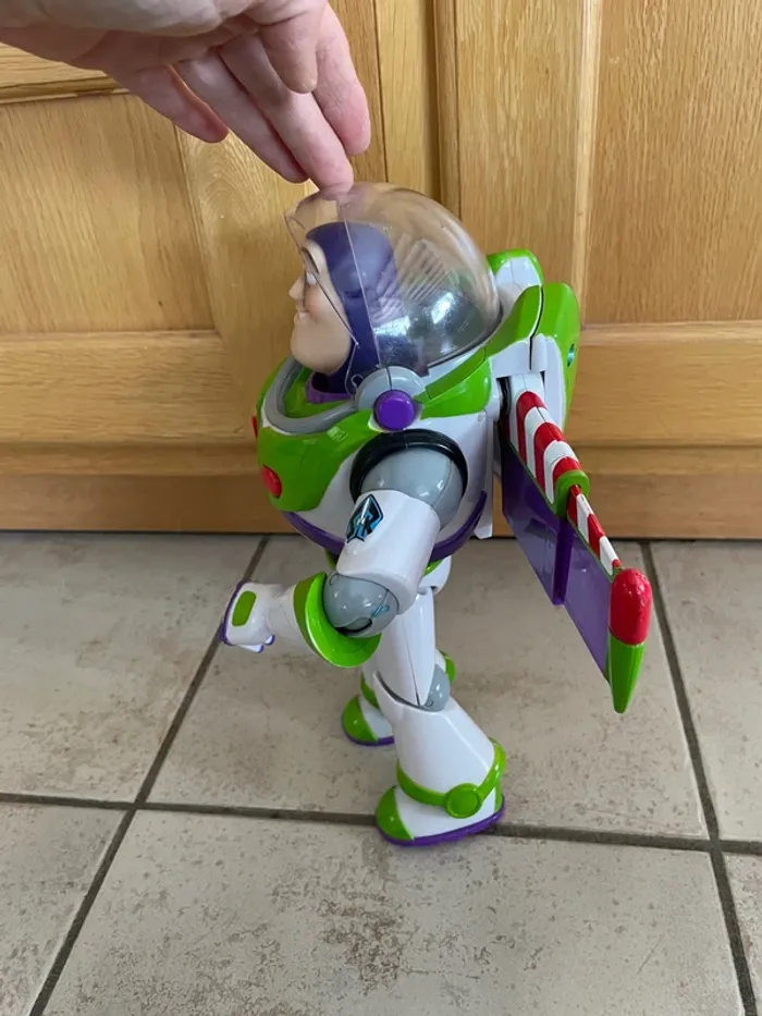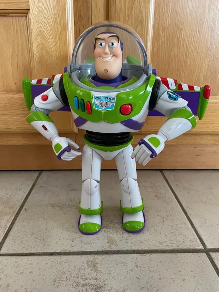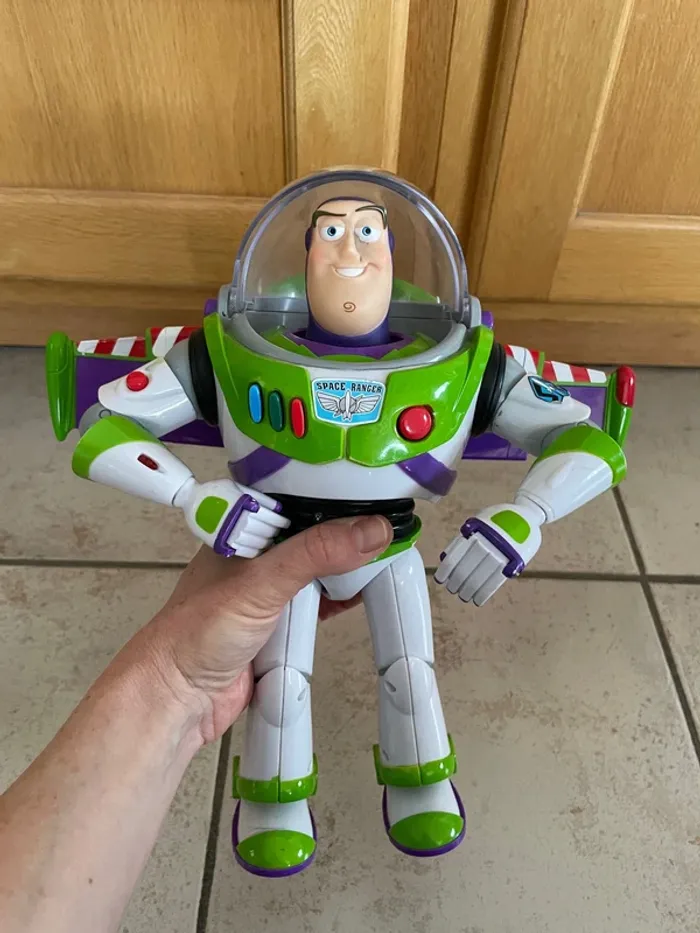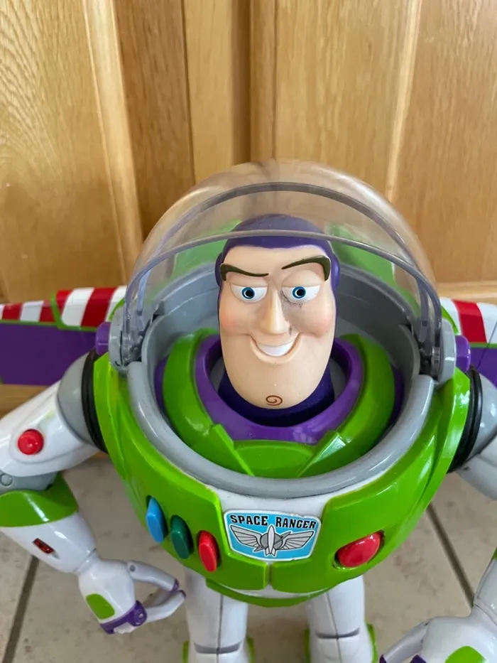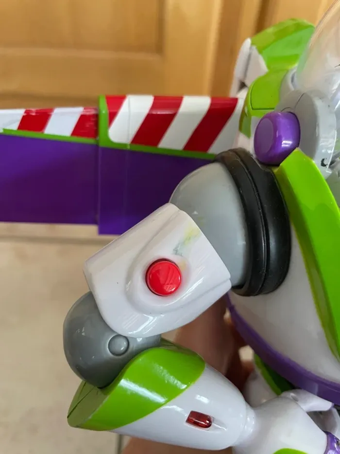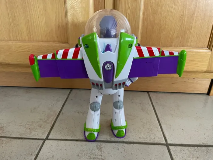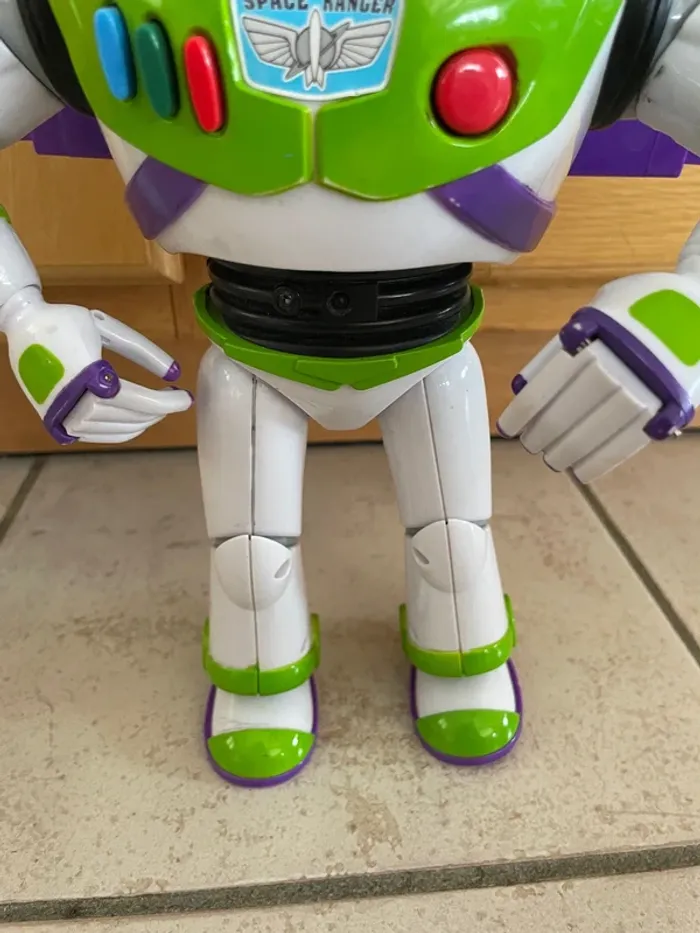 Gros jouet Buzz l'éclair, assez lourd. Thinkway Toy Piles incluses, fonctionne bien (parle en français) Globalement en bon état même si il a été utilisé. Des petites traces d'utilisation (j'essaiera d'en enlever avec une gomme magique quand c'est possible notamment dans le dos) Le laser ne s'allume pas (mais il fait le son) je ne sais plus si à l'origine il s'allumait ou pas? D'un modèle à l'autre ils n'ont pas tous les mêmes fonctions. J'ai pas mal d'autres figurines de Toy Story et Buzz l'éclair dans mes annonces.