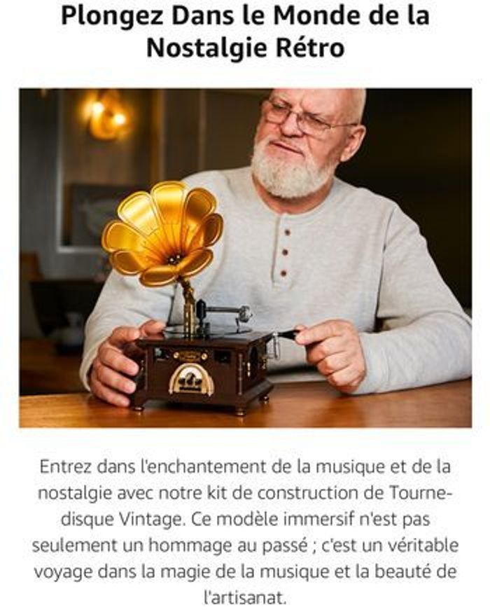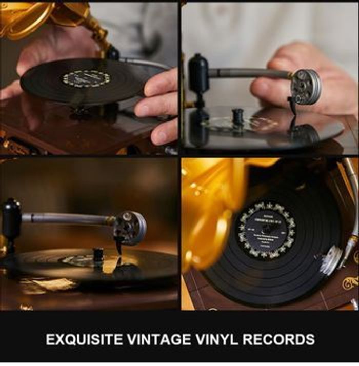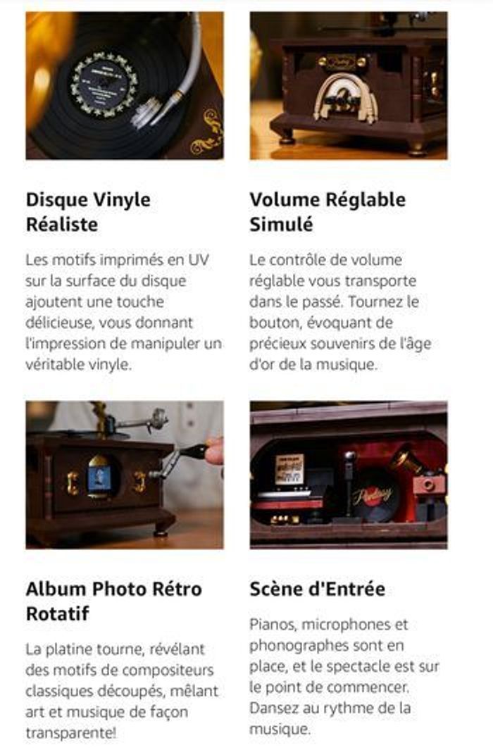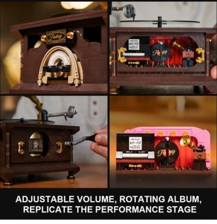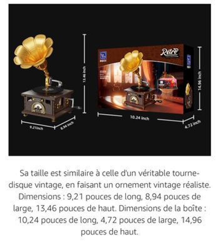 totalement neuf jamais utilisée ni sortie de son carton d origine compatible lego PANTASY Ensemble de Construction de Gramophone Vintage Kit de Modèle de Lecteur de Musique Rétro Un Chef-d'Œuvre de Nostalgie Musicale Tourne-disque Réaliste & Album Photo Rotatif Compatible avec lego 【Contrôle de Volume Authentique et Reproduction de la Scène de Spectacle】​Remontez le temps avec le contrôle de volume authentique du gramophone, recréant le charme des gramophones classiques. Tournez le cadran frontal et regardez le pointeur bouger, tout comme sur un gramophone classique. De plus, cet ensemble comporte une réplique détaillée d'une scène musicale, ajoutant une couche supplémentaire d'authenticité et de charme à votre expérience de construction. 【Disque Vinyle Mobile】Redécouvrez la joie du disque vinyle avec notre tourne-disque en acrylique méticuleusement fabriqué. Le motif de surface imprimé en UV ajoute une touche visuellement attrayante, assemblant un tourne-disque rétro avec cet ensemble de la construction. c'est une expérience qui rappelle la manipulation d'un vrai tourne-disque. Déplacez doucement le bras de lecture, et le disque vinyle commence sa rotation envoûtante, le tout grâce à la magie de la construction. 【Album Rétro Interactif】Lancez-vous dans un voyage captivant à travers le temps avec notre album photo vintage. Lorsque vous déplacez le bras de lecture, l'album prend vie, tournant en harmonie avec le vinyle qui tourne. Grâce à des découpes astucieusement conçues, vous apercevrez quatre compositeurs classiques emblématiques, mêlant harmonieusement art et musique. C'est comme construire un morceau d'histoire musicale avec cet ensemble de construction.