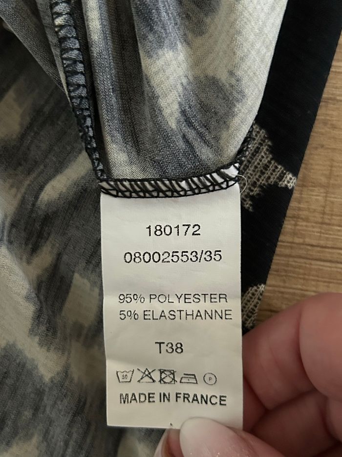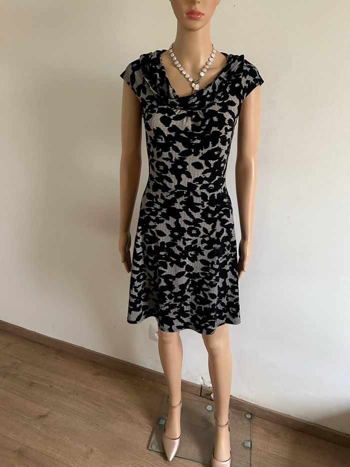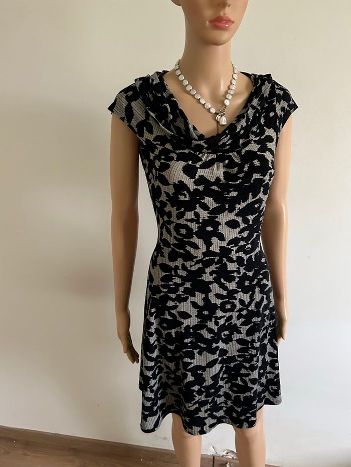 Jolie robe grise et noire à manches courtes, de marque LolaLiza. Taille 38. Peu portée, mais présente un défaut : un accroc sur un côté de la robe (voir photo). aisselle à aisselle 43 cms et plus taille 38 cms et plus longueur depuis épaule 88 cms Le tissu est extensible 95% polyester et 5% elasthanne