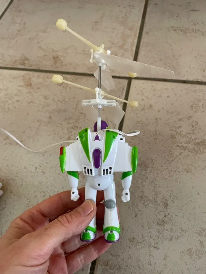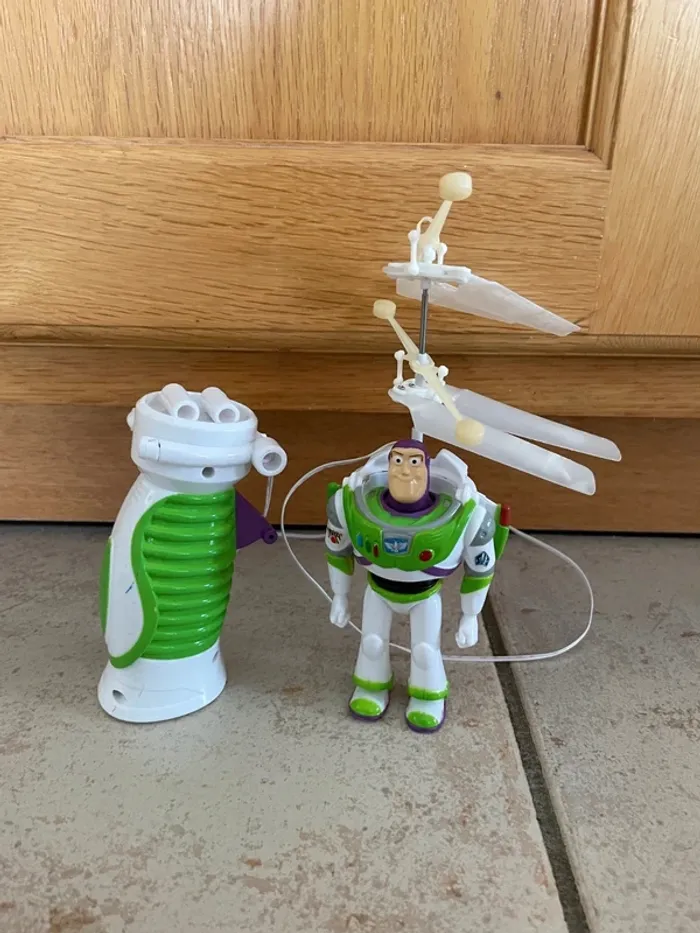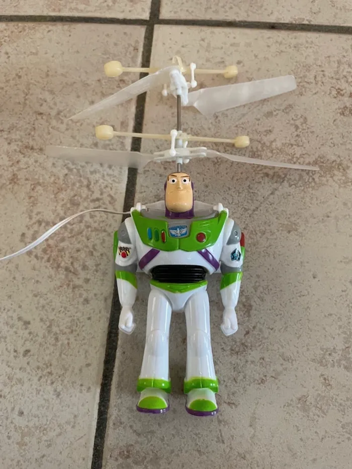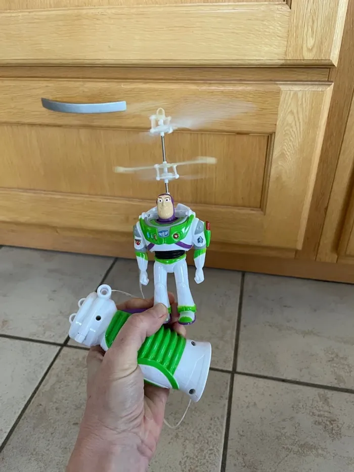Dickie Toy Story 4 Buzz Volant Filoguidé avec télécommande Petite figurine de Buzz l'éclair (Buzz Lightyear) avec sa poignée qui le fait "voler". Info vérité: mon fils le voulait absolument dans sa collection mais ce n'était pas vraiment pour jouer avec. Pour qu'il plane légèrement il faut des piles neuves puissantes. Piles fournies, les pales tournent mais ça ne vole pas vraiment ;) Jouet qui m'a toujours semblé assez fragile, plutôt pour un collectionneur que pour jouer avec. J'ai pas mal d'autres figurines de Toy Story et Buzz l'éclair dans mes annonces.