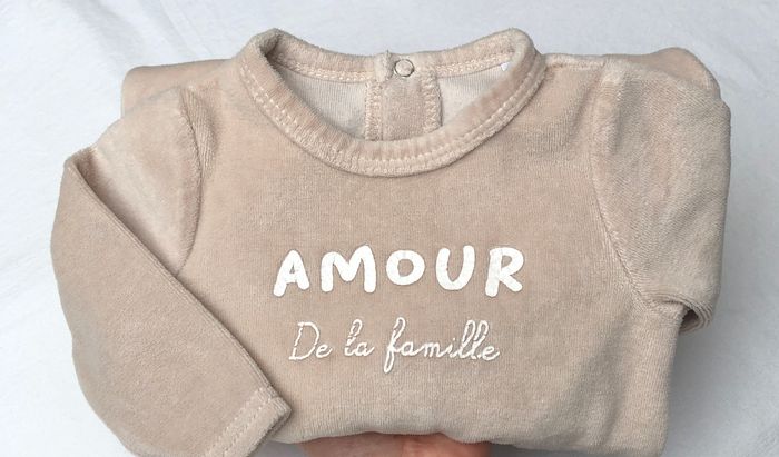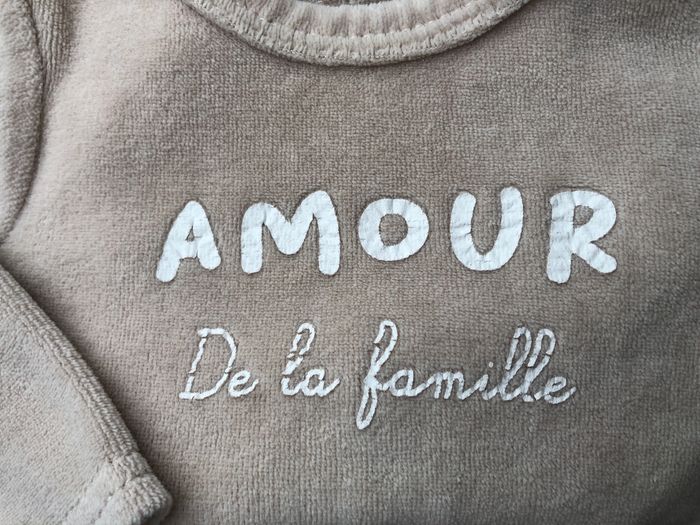 Pyjama hiver une pièce, grenouillère, dors bien Mes Petits Cailloux, Taille 3 mois/ 59 cm. En velours beige foncé, inscription « Amour de la famille ». Mixte. Ouverture par pressions dans le dos. En très bon état, sans trou ni tache. A noter que le nom de la marque est effacé, et que les écritures du message sont légèrement coupées, mais le velours est extrêmement doux. 🌸 Vous aimez cet article ? N’oubliez pas de visiter le reste de mon dressing en filtrant les tailles.