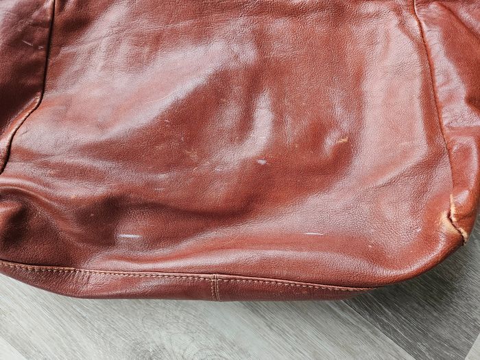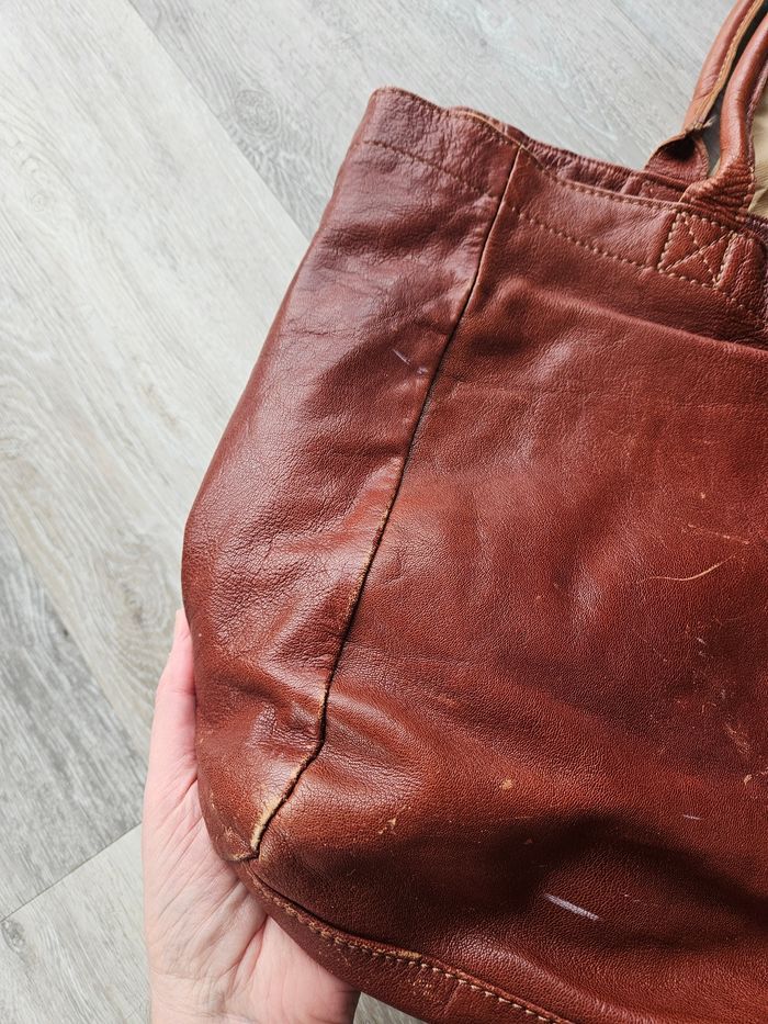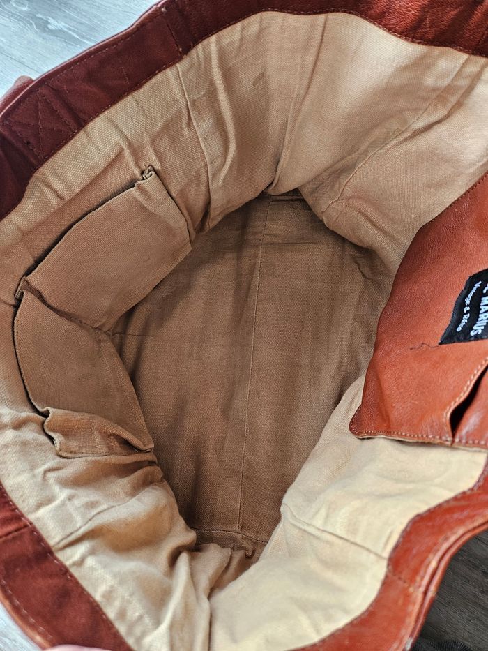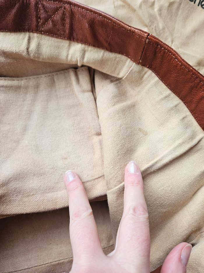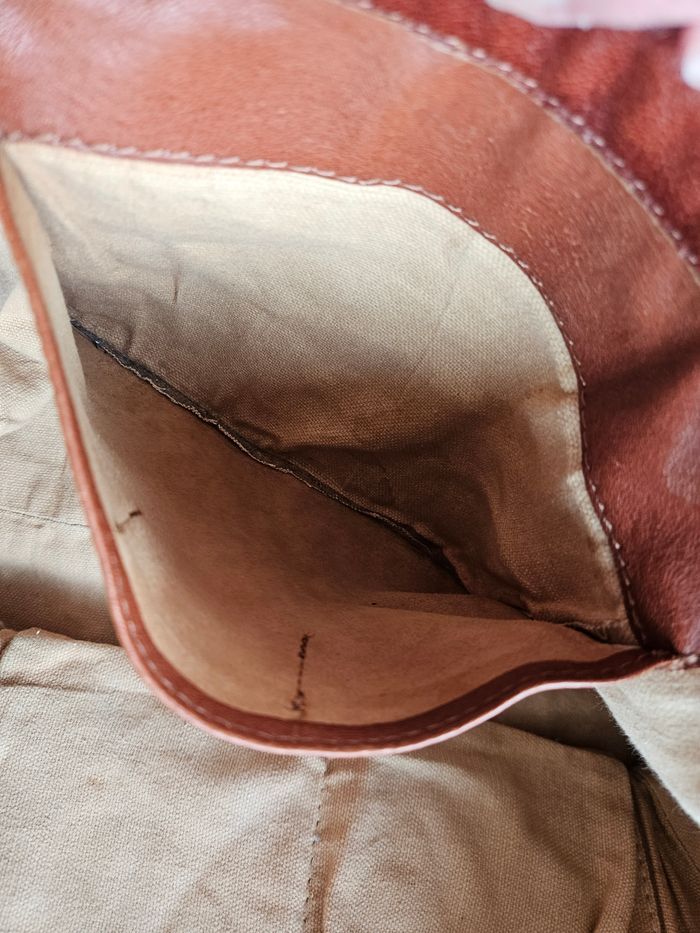 Sac en cuir coloris "naturel" 35x33x19cm Il a servi, le cuir est marqué par l'usage (qqs tâches sur le tissu également), mais l'aspect général du sac est très bon. Il a été intégralement nettoyé/désinfecté pour la mise en vente. Environnement propre et non fumeur.