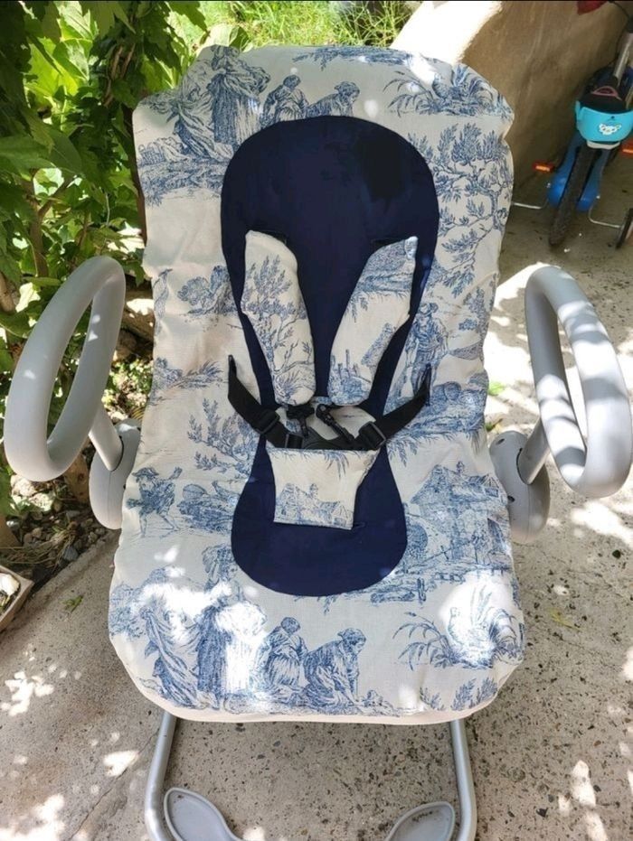Housse qui s'ajoute à l'assise ( coussin) d'origine béaba . Imprimé toile de jouy/ bleu marine. Accessoires sangles et entre jambe assortis.