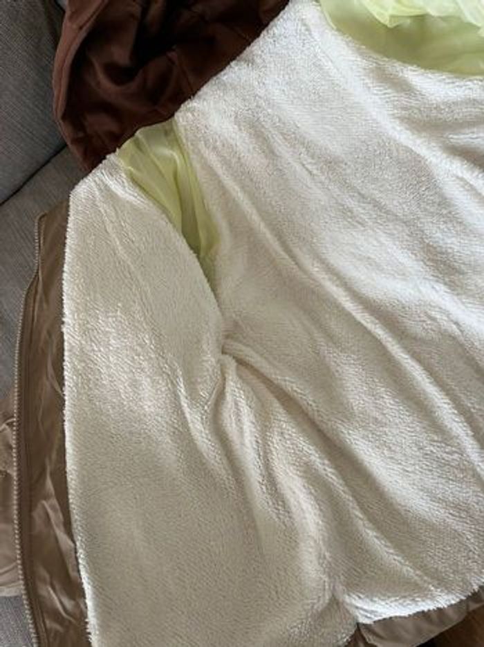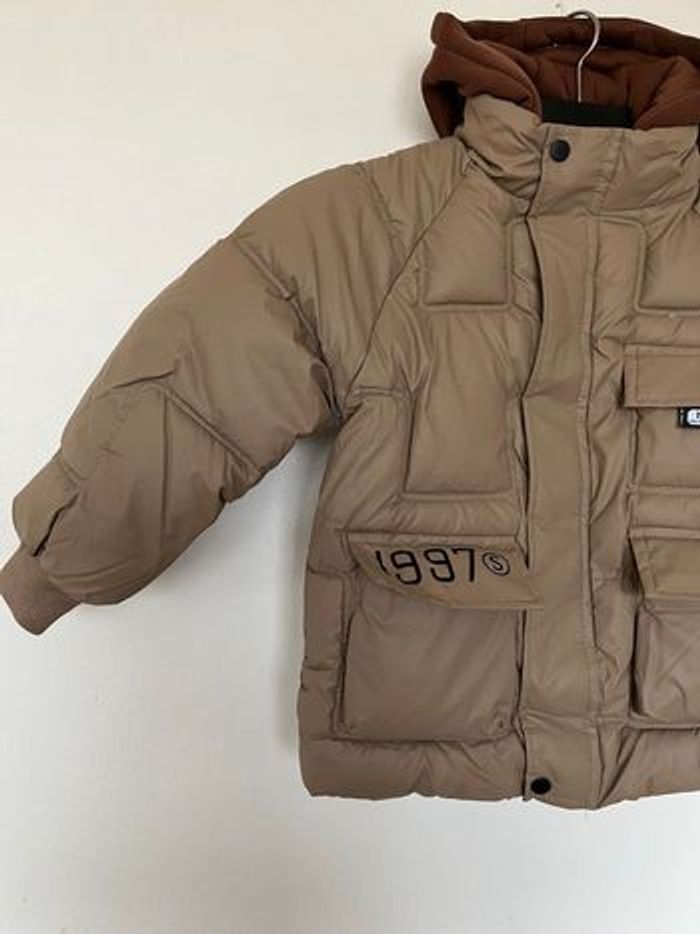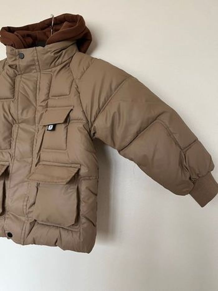 Doudoune avec capuche non amovible Fermeture à glissière + boutons pressions Poignet élastiques 2 poches à rabat Article neuf 100% polyester Coloris marron,camel