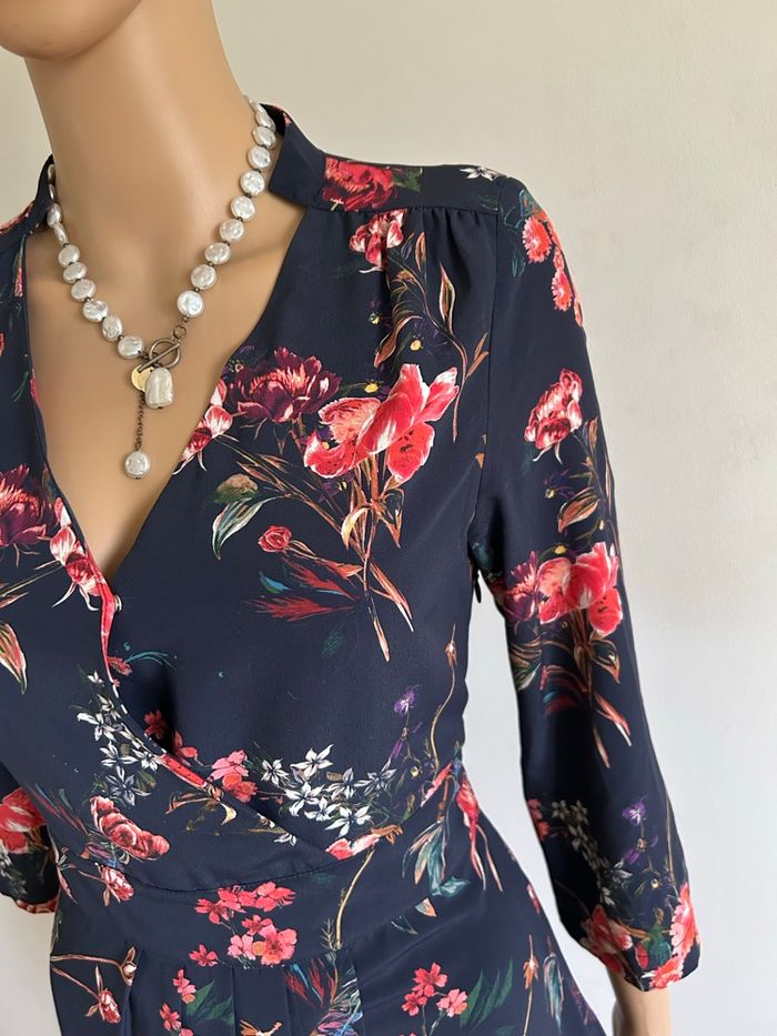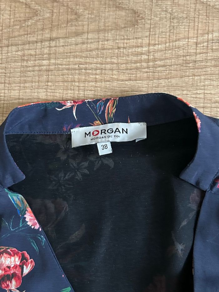 Magnifique robe bleue marine et fleurie avec manches 3/4, de marque Morgan. Fermeture sur le côté. Taille 38. Jamais portée, état neuf. aisselle à aisselle 46 cms épaule à épaule 36 cms taille 38 cms longueur depuis épaule 94 cms 100% polyester