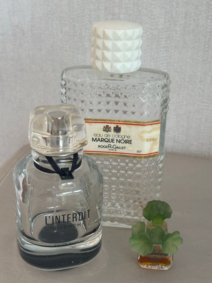 Lot de 3 flacons en verre / bouteilles de parfum décoratives : * Eau de Cologne Marque Noire 200 ml Roger Gallet * L’Interdit de Givenchy * Mignonnette Cabotine de Grès