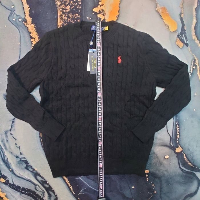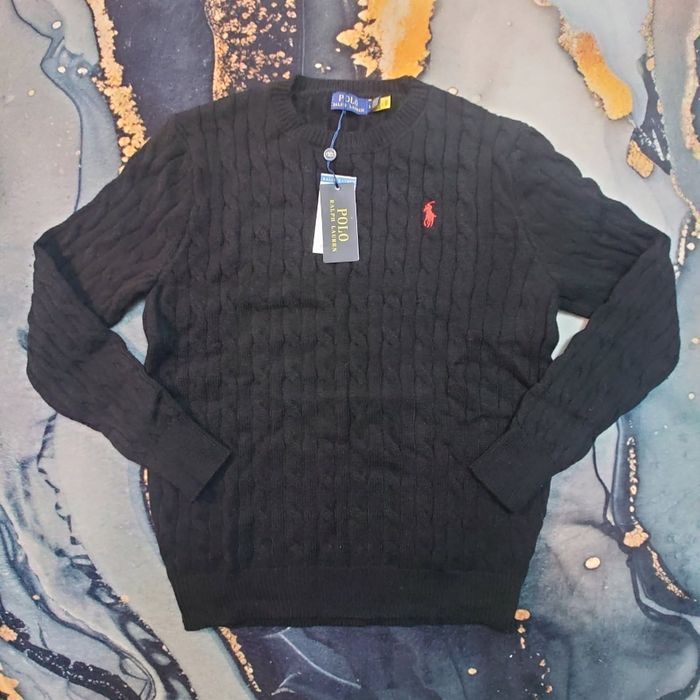 Pull torsadé col rond Polo Ralph Lauren noir logo brodé rouge taille L - photo numéro 1