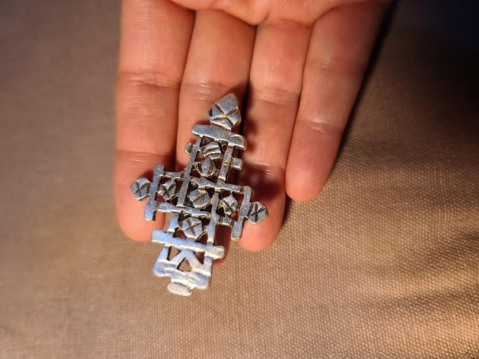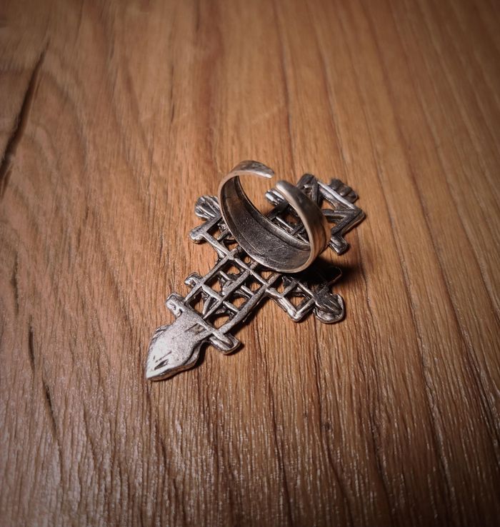 Bague de caractère au design graphique et ajouré. Finition patinée d’inspiration artisanale, avec une belle présence au doigt et un style affirmé. Détails : • Plaqué argent, aspect vieilli • Très bon état, jamais portée • Bague ajustable • Dimensions : env. 5,4 × 3,6 cm Envoi rapide et soigné via Beebs.