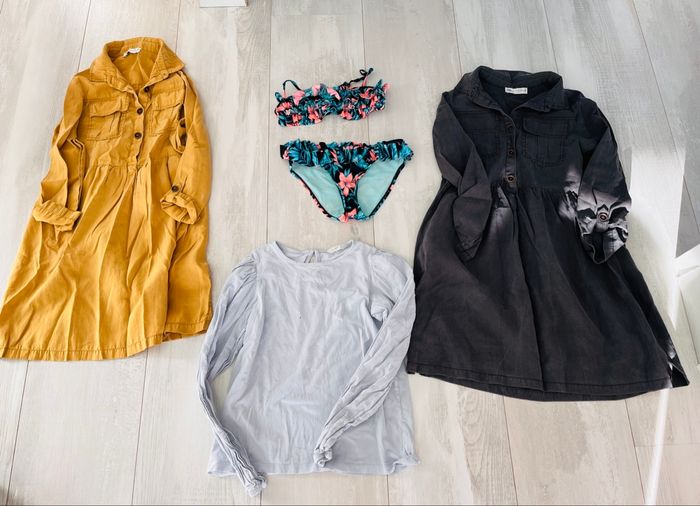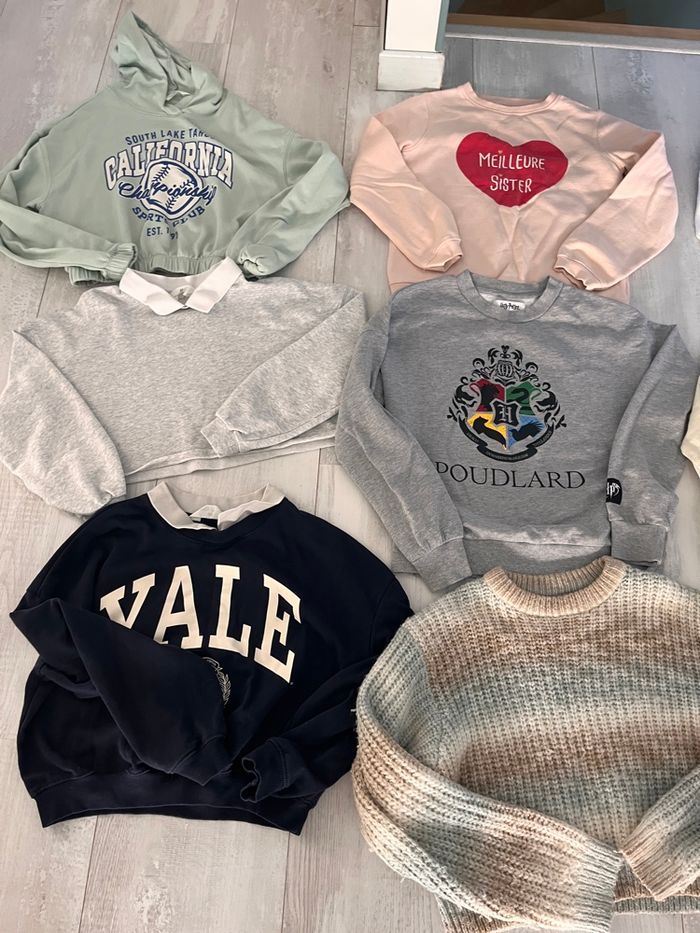 Lot de 18 vêtements pour fille Taille 12 ans Comprend: - 2 robes manches longues Zara 11/12 ans (1 moutarde et 1 noire) - 1 maillot de bain 2 pièces - 1 haut bleu manches longues Mango 11/12ans (présence d’une petite tache de crayon devant) - 1 jegging bleu Kiabi 12ans NeUF - 1 jegging gris clair Gemo 12 ans - 1 jean noir stretch Jennyfer taille 30 - 1 jegging bleu marque U 12 ans - 1 pull en laine Gemo 12 ans (un peu bouloche) - 1 sweat noir « mes amies » Mango 11/12 ans - 1 sweat court jaune Zara 13/14 ans - 1 sweat rose « meilleure sister » Vertbaudet 12 ans - 1 sweat blanc à fleurs Kiabi 12 ans - 2 sweat (1 bleu matin et 1 gris) H&M 10/12 ans - 1 sweat vert court H&M 14 ans - 1 sweat gris Harry Potter XS