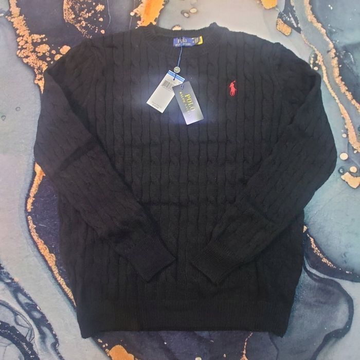 Pull torsadé col rond Polo Ralph Lauren noir logo brodé rouge taille XL - photo numéro 1