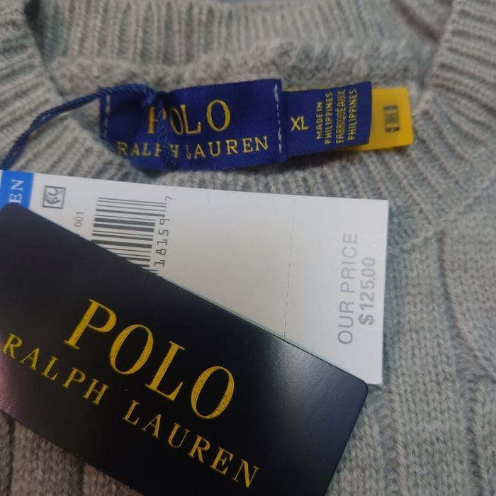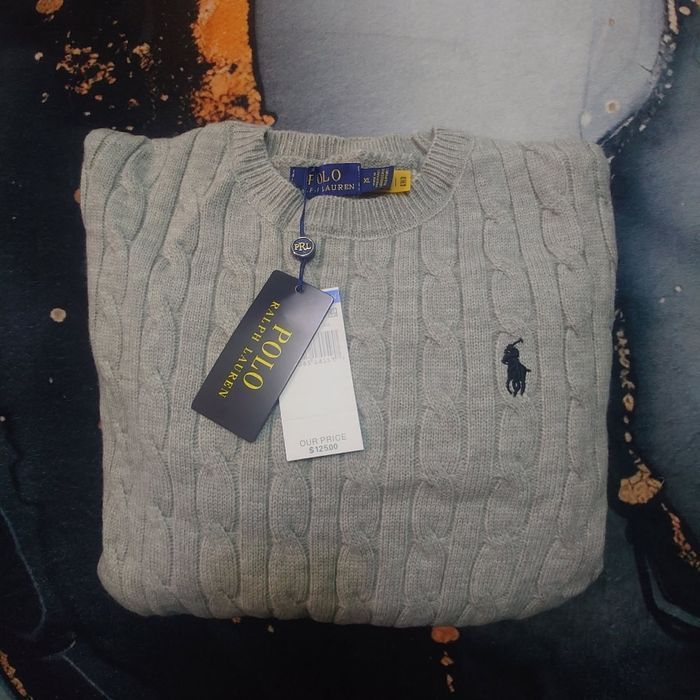 Pull torsadé col rond Polo Ralph Lauren gris logo brodé noir taille XL - photo numéro 1