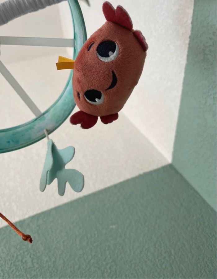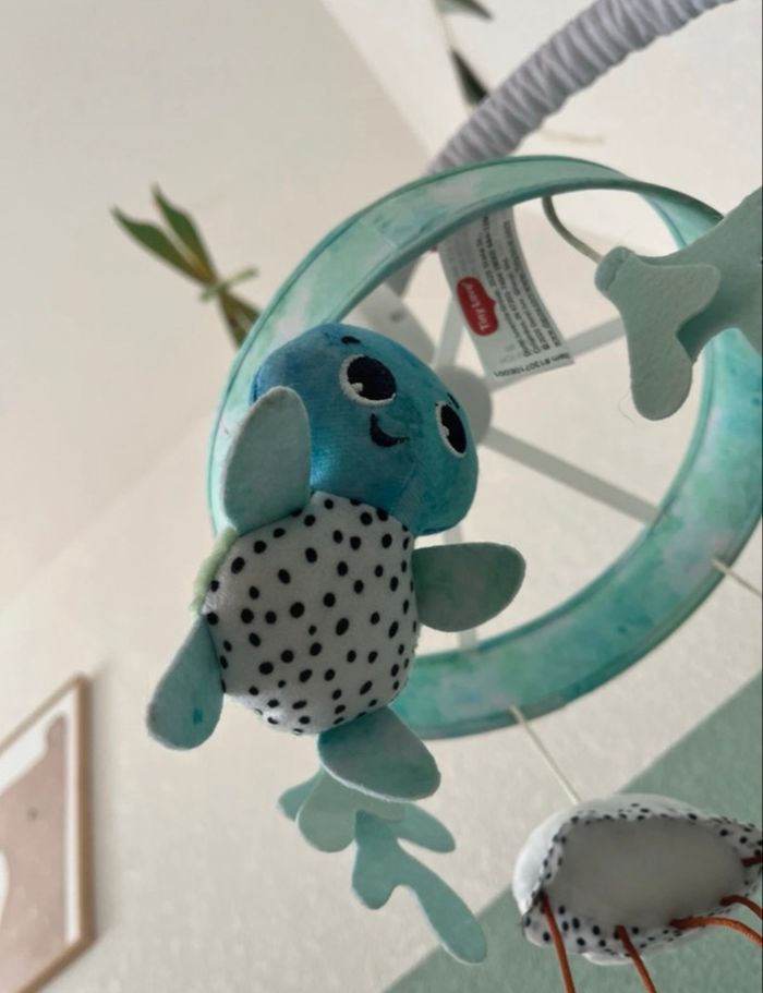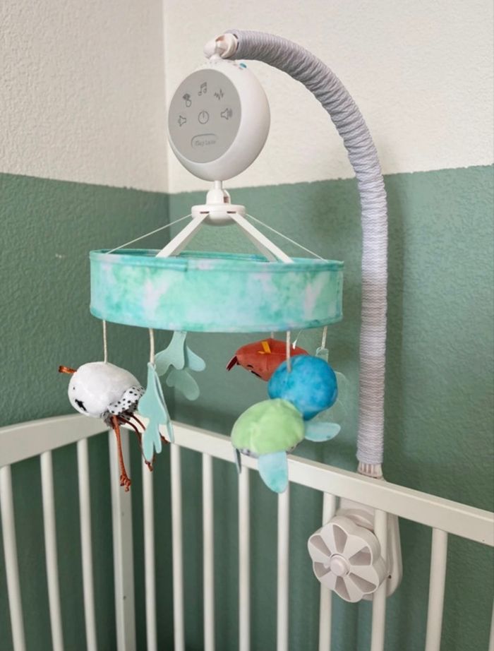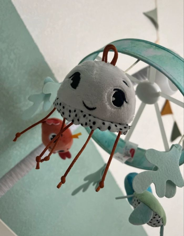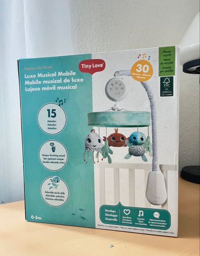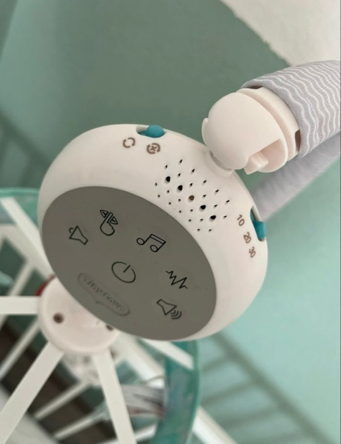 Mobile musical de Tiny Love En blanc, vert et bleu, avec de jolis pendentif de divers animaux, sur le thème sous-marin. Le mobile peut jouer 15 mélodies et 5 sons apaisants. Facile à accrocher car un long bras avec une coque souple est inclus. Le mobile musical est doté d'une minuterie qui s'éteint automatiquement après 10,20 ou 30 minutes et vous pouvez également augmenter ou diminuer le volume. À servis à peine 1 mois. Vendu dans avec la boîte d’origine et la notice