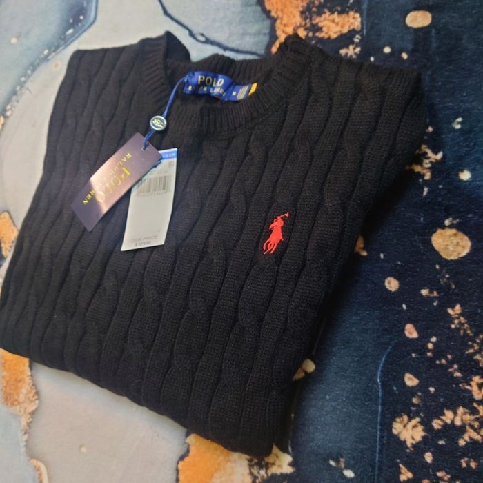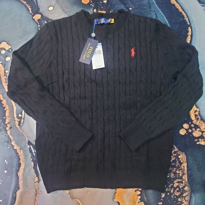 Pull torsadé col rond Polo Ralph Lauren noir logo brodé rouge taille M - photo numéro 1