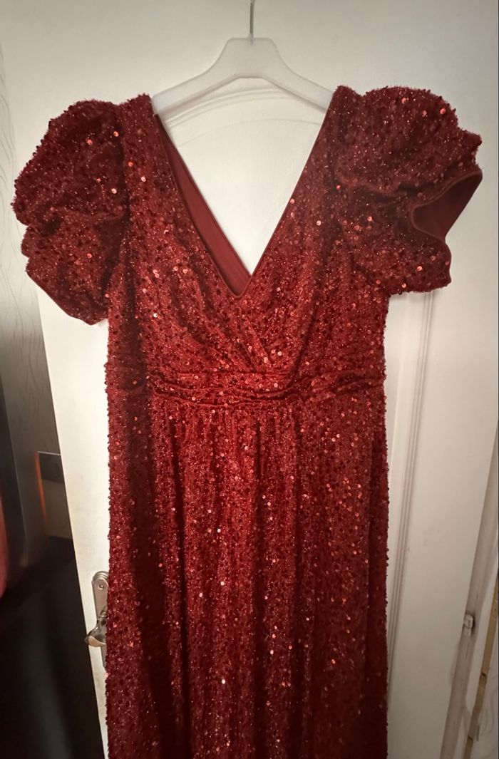 Robe de fête avec encolure en V scintillante pailletée et manches bouffantes UNITHORSE. Taille XXL couleur rouge bordeaux ce n’est pas un rouge vif . Neuve Jamais portée car trop grande sur moi mais sans étiquette