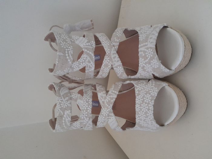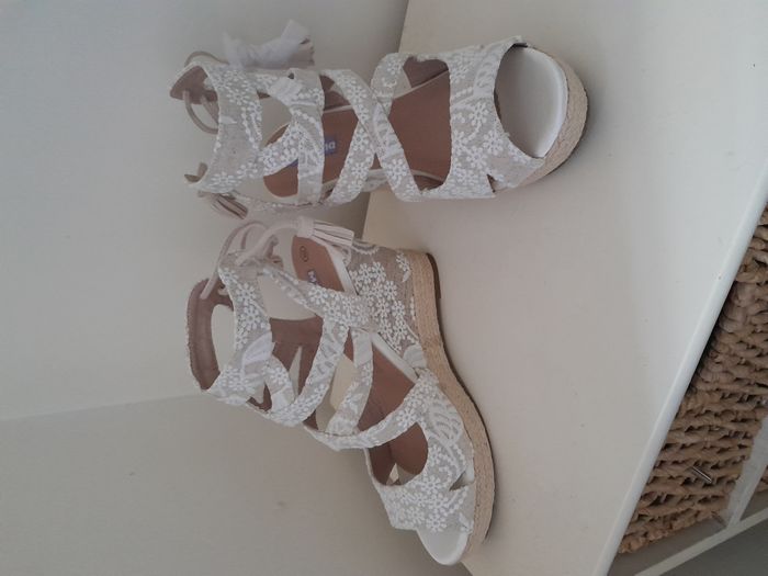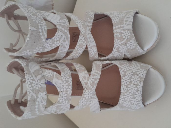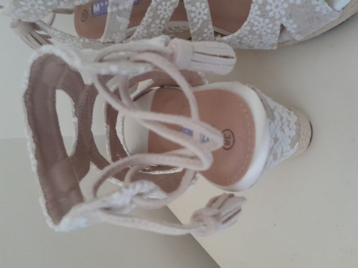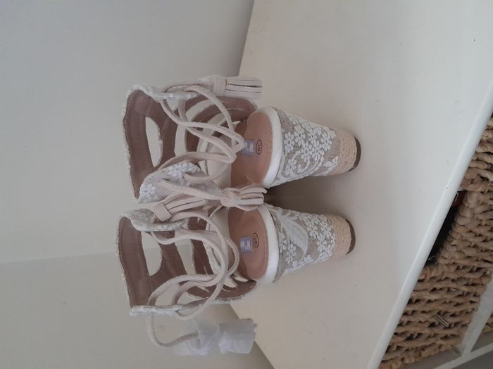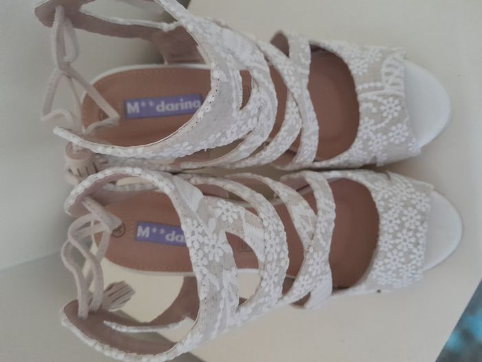 Chaussure été, monte à la cheville, talon compenser, avec plate-forme, attache nœud derrière Talon : 10cm, plate-forme : 2cm Marque : M Darina