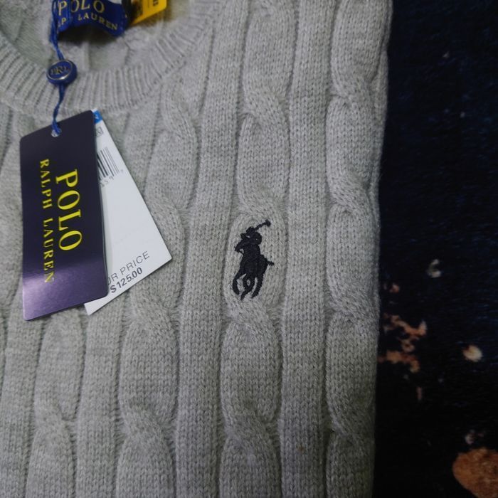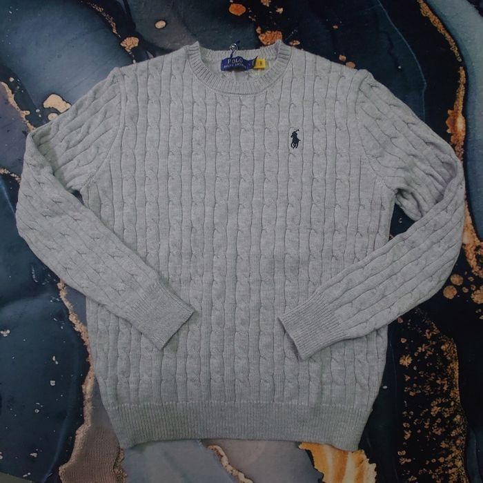Pull torsadé col rond Polo Ralph Lauren gris logo brodé noir taille L - photo numéro 1