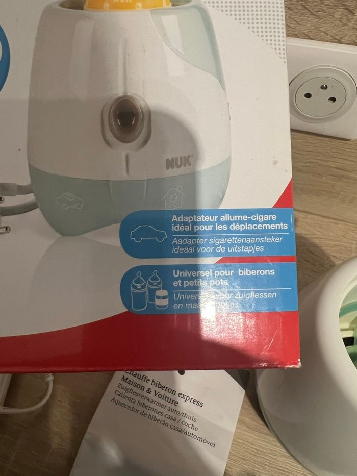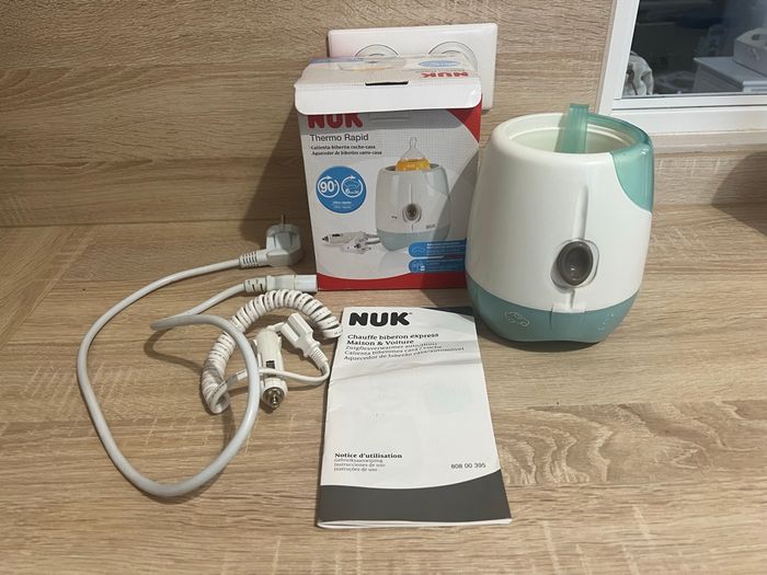 Chauffe-biberon NUK complet Vendu avec adaptateur allume-cigare, idéal pour les déplacements et les voyages. Modèle universel, compatible avec la plupart des biberons et des petits pots. Pratique, compact et facile à utiliser.
