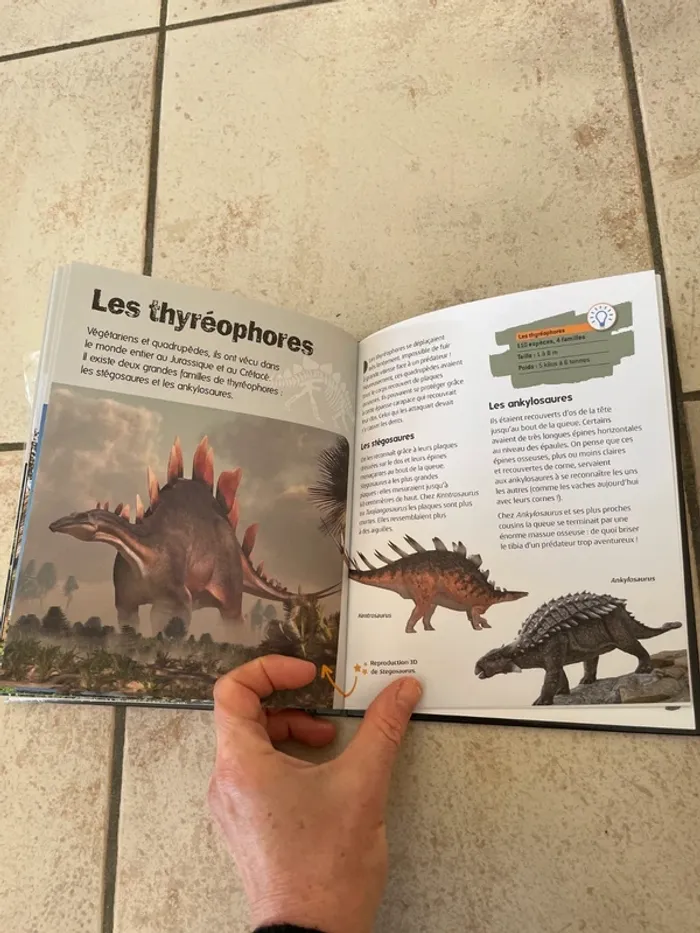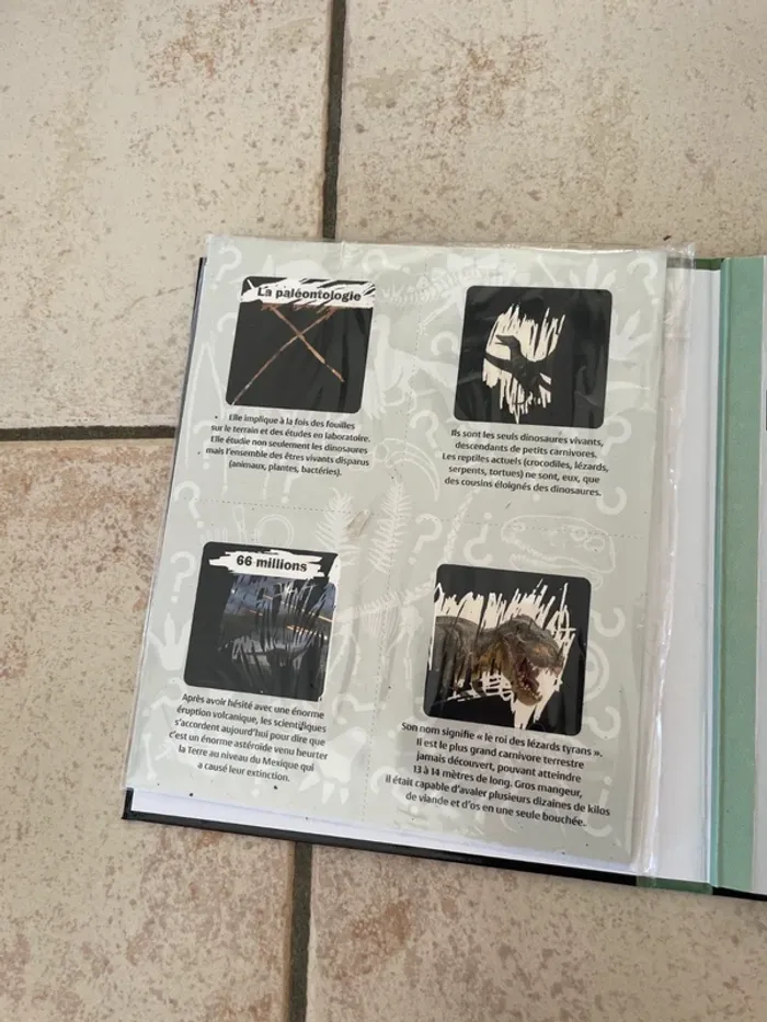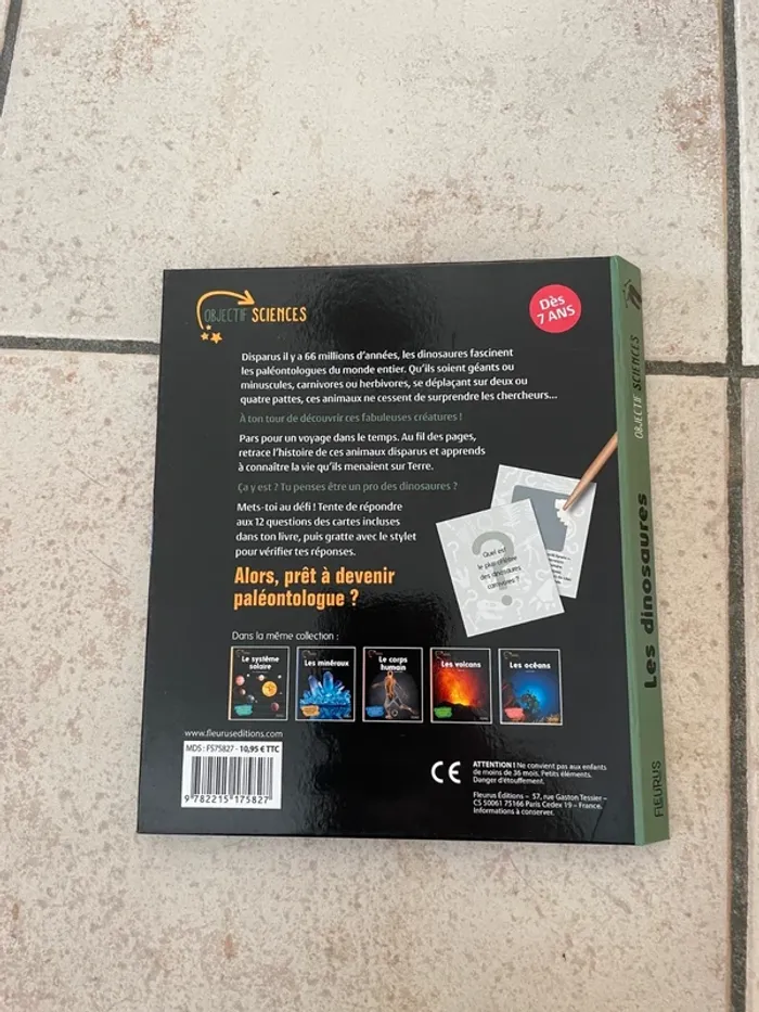 Livre objectif science Les Dinosaures (Fleurus) A la base il y avait 12 cartes à gratter qui posent des questions sur le contenu du livre, elle sont en partie été déjà grattées mais le livre en lui-même est toujours ok! Pour les petits passionnés de dinosaures.
