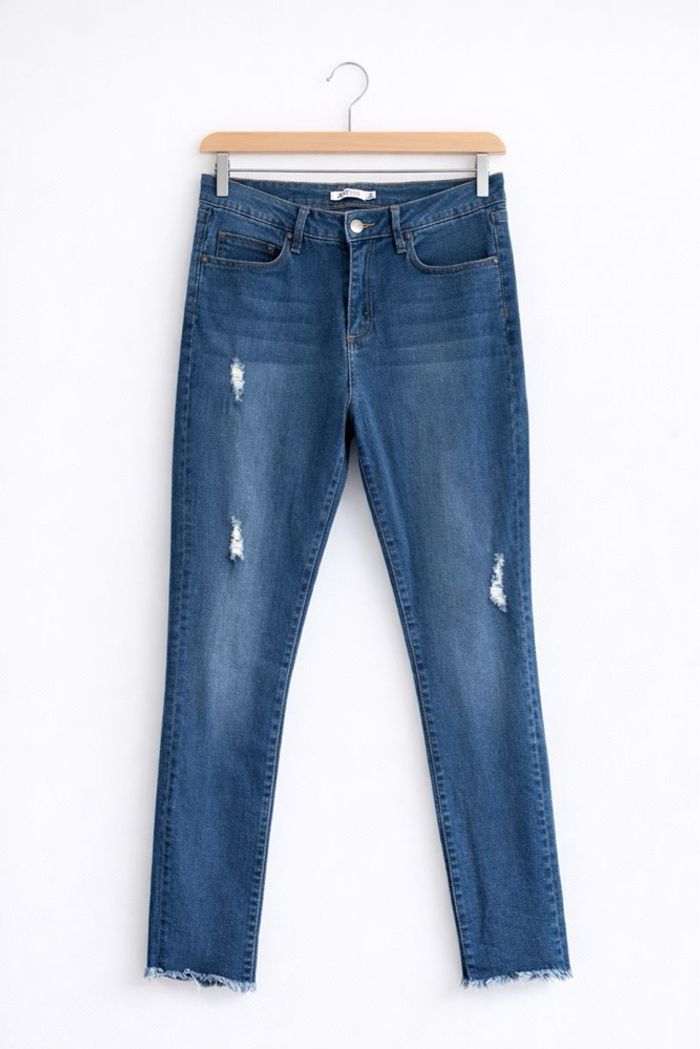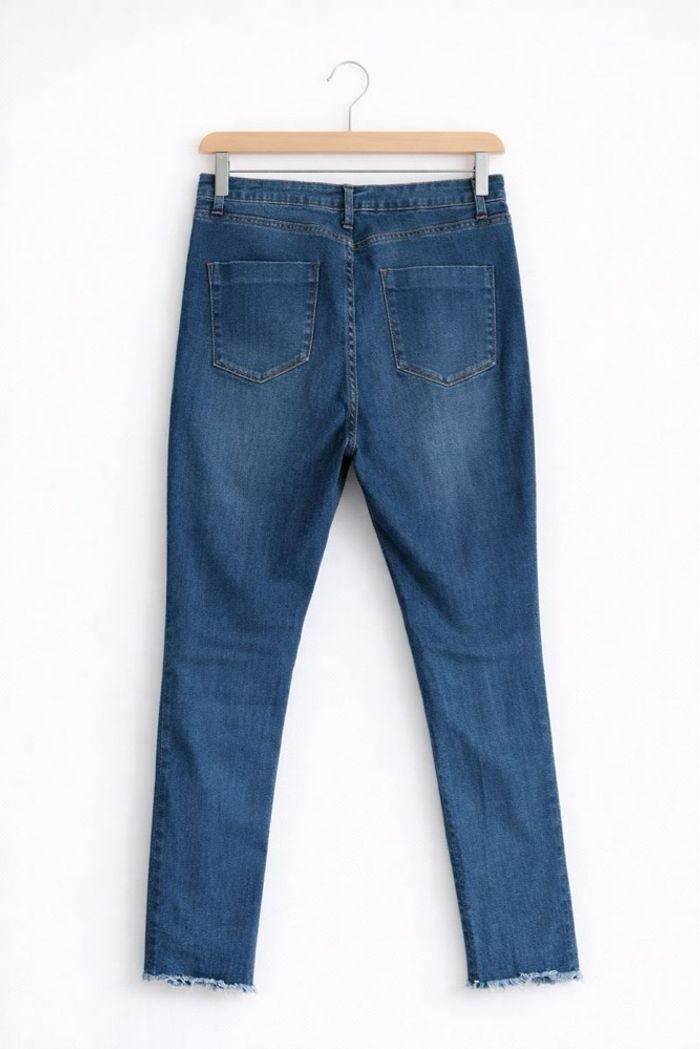Jean à taille haute, coupe slim avec faux trous comme décoration. Possède 2 poches latérales et 2 poches arrière. Marque : Justfab Taille 38-39