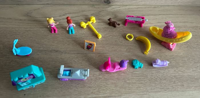 parc de jeux avec 3 niveaux vendu avec tous les accessoires sur la deuxième photo (il en manque quelques un du coffret initial) 2 mini-poupées Polly et Lila et le chien Peaches Avec lanière pour le porter sur l’épaule comme un sac à main à partir de 4 ans excellent état