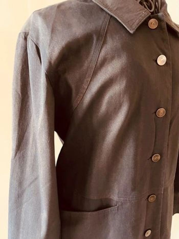Veste avec effet usée brillant Made in France Légèrement cintrée avec 2 poches avant D’épaule à épaule 46 cm D’aisselle à aisselle 54 cm Longueur 65 cm Longueur des manches 53 cm 96 % coton, 4 % elasthane Doublure 100% polyéthylène État impeccable