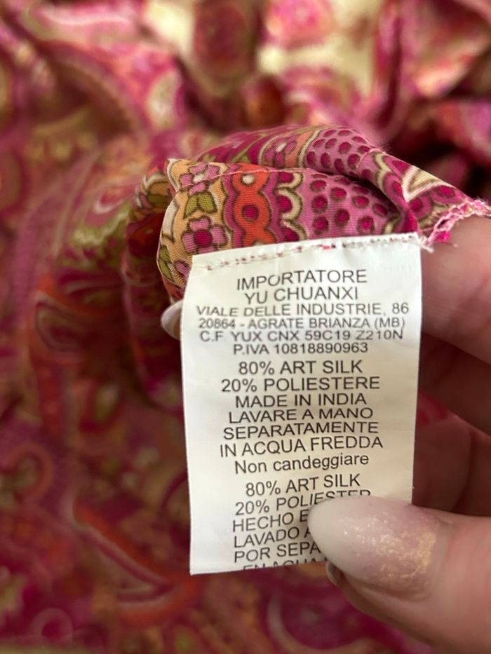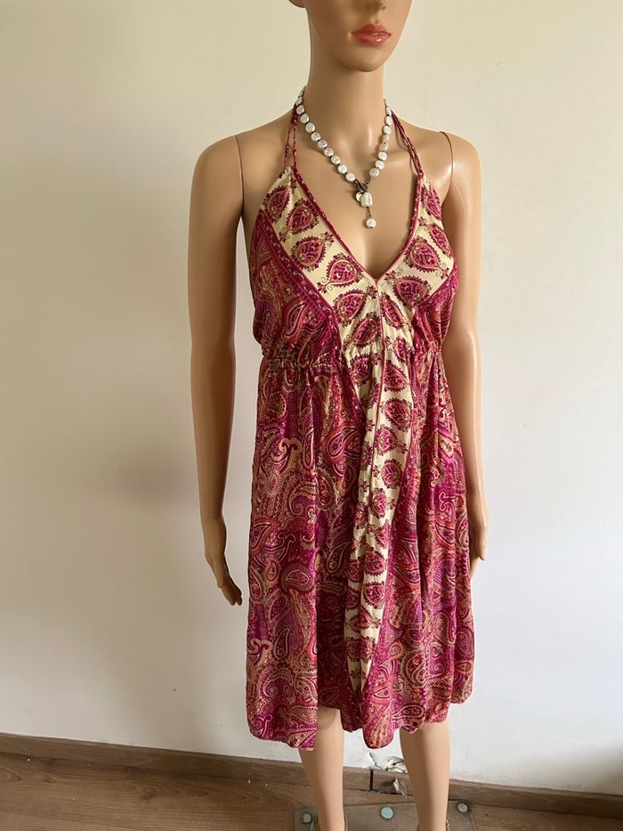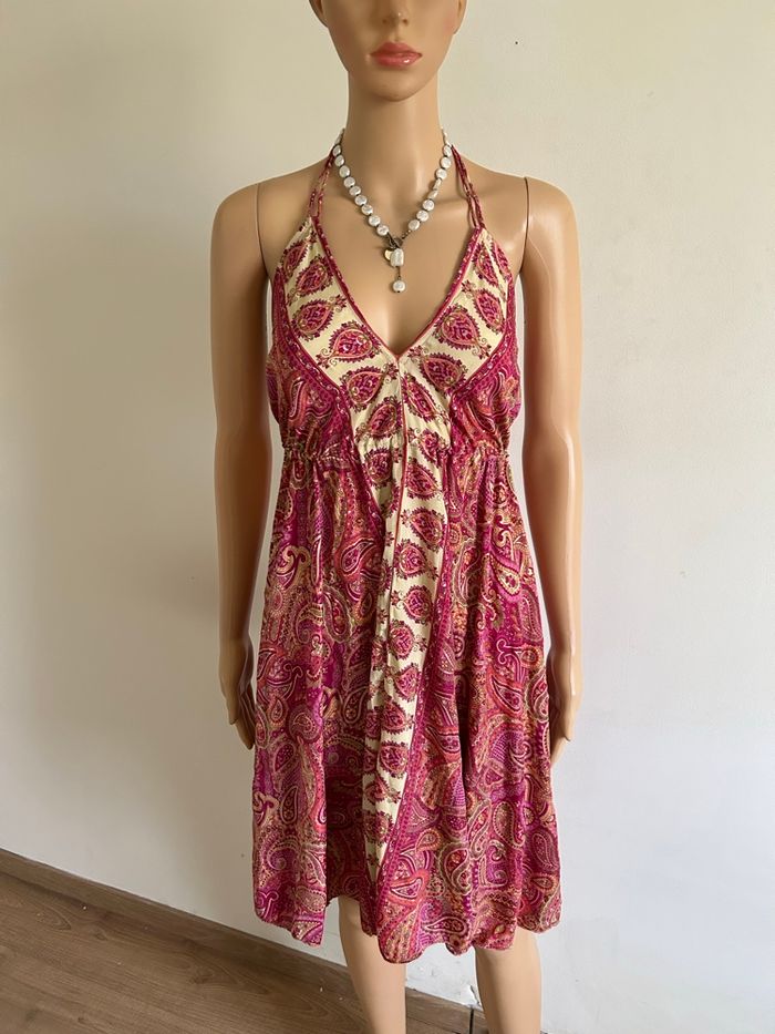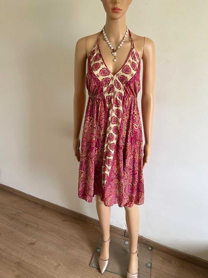 Jolie robe rose en soie, avec dos nu. Taille unique qui convient jusqu’au 40. Jamais portée, état neuf. 80% soie et 20% polyester