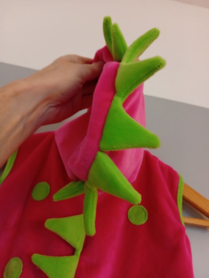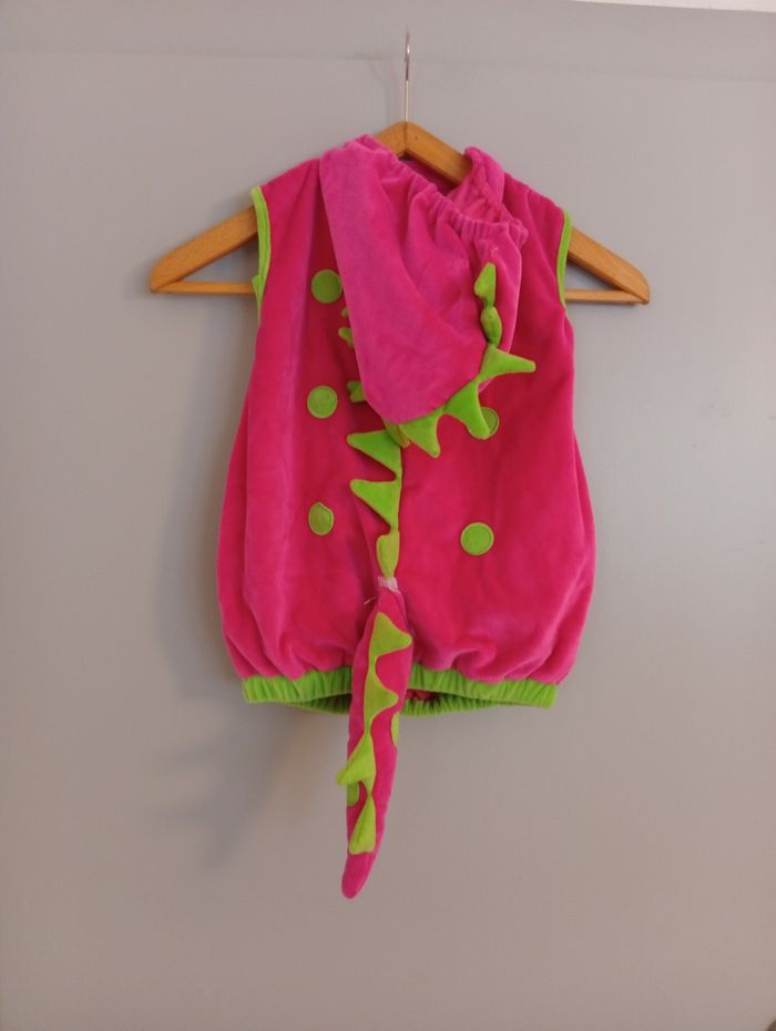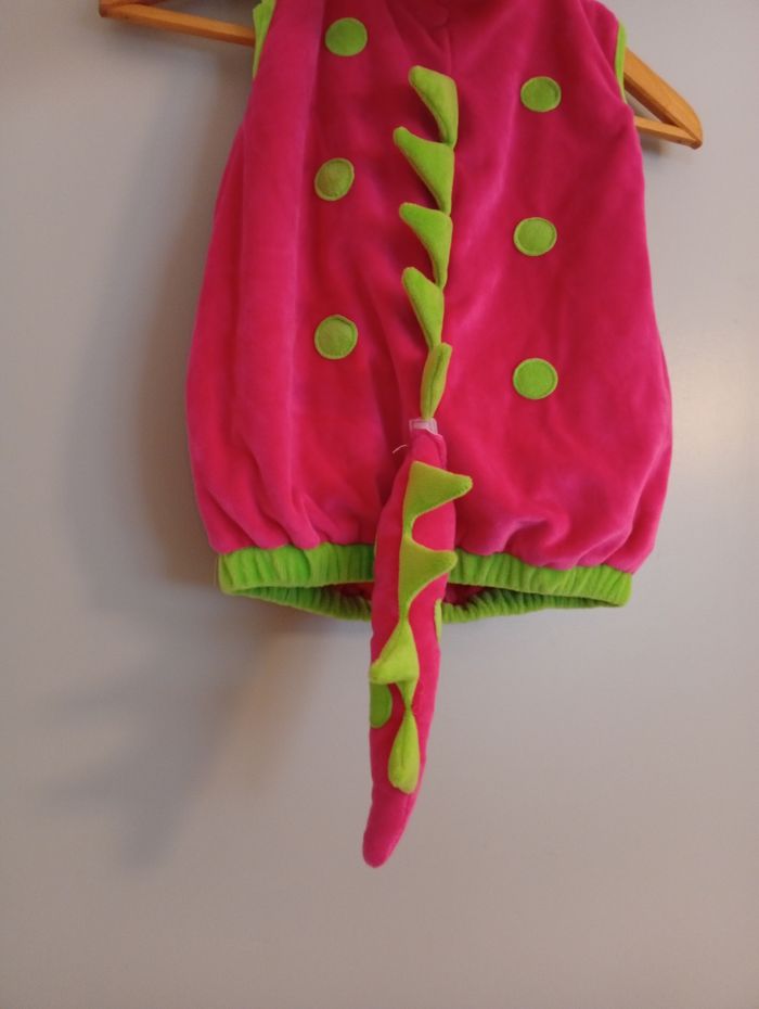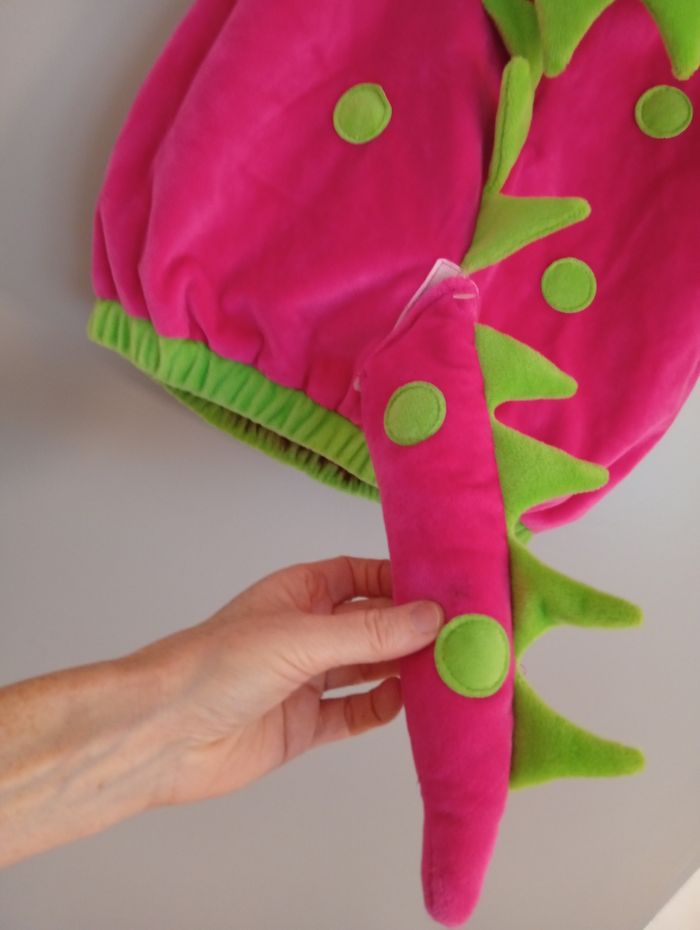 Pour fille. Fuchsia et vert fluo. Polyester. Ou dragon. Queue avec velcro. À pois. Écailles.