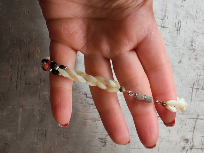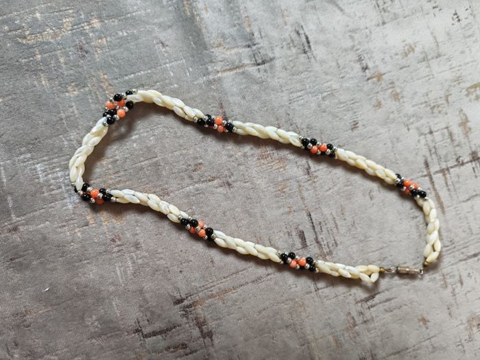 Collier vintage en 3 rangées de perles nacrées en forme de riz de couleur blanc cassé et d'autres perles : noires, couleur corail et argentée. Collier est en très bon état, fermoir se visse. Dimensions : Longueur : 45 cm Epaisseur : 7-8 mm Poids : 30 g