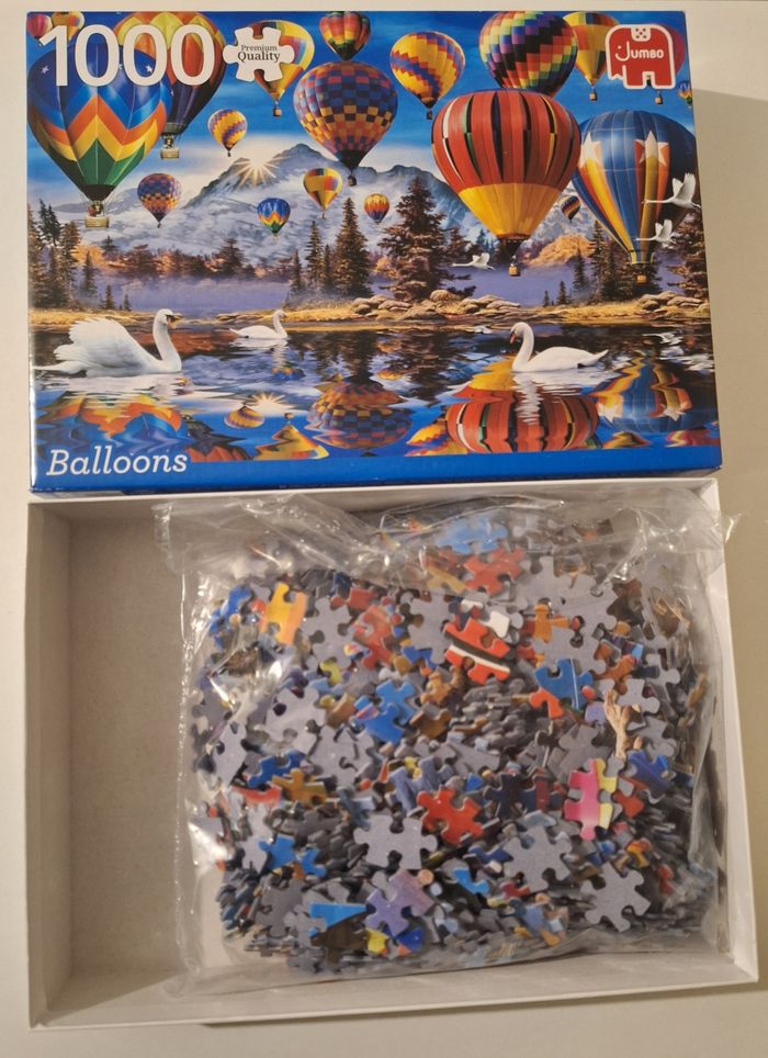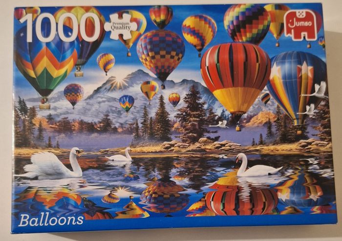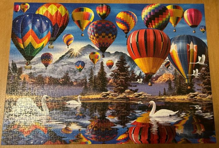 Puzzle 1000 pièces de 68 cm x 49 cm, décor : montgolfières, montagnes et cygnes. Fait une fois. Complet.