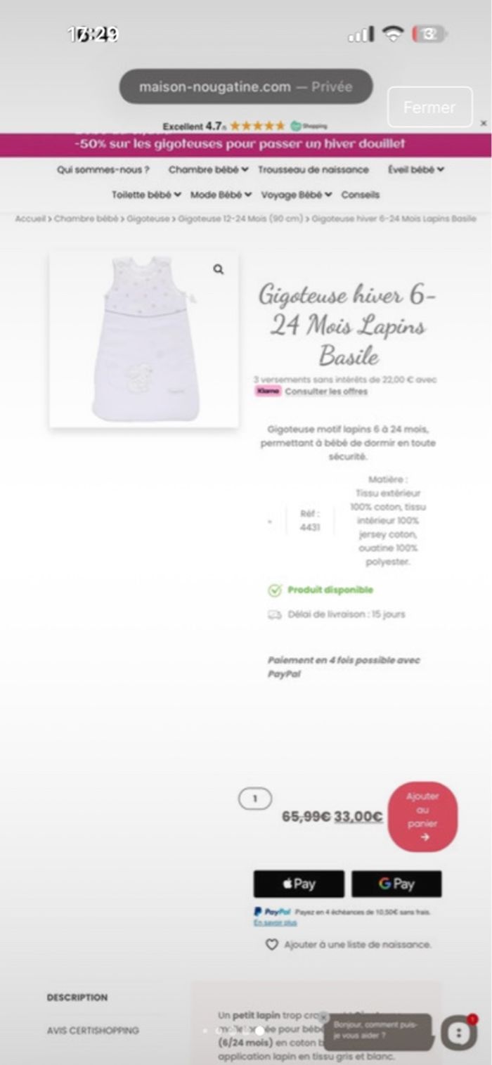 Gigoteuse turbulette bébé taille 1mois jusqu'à 6mois marque nougatine prix en boutique 65e