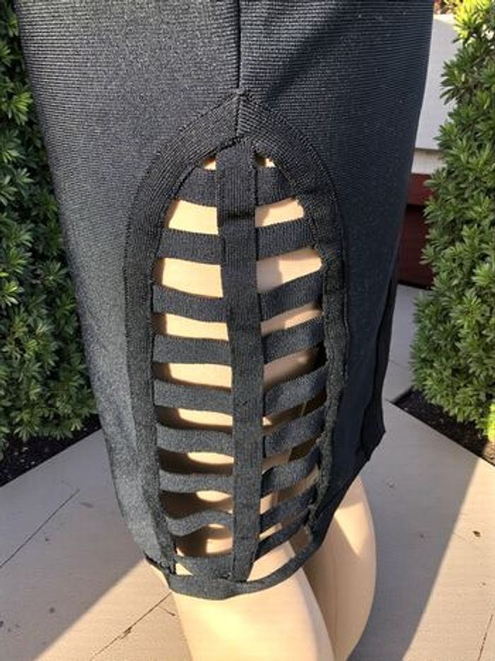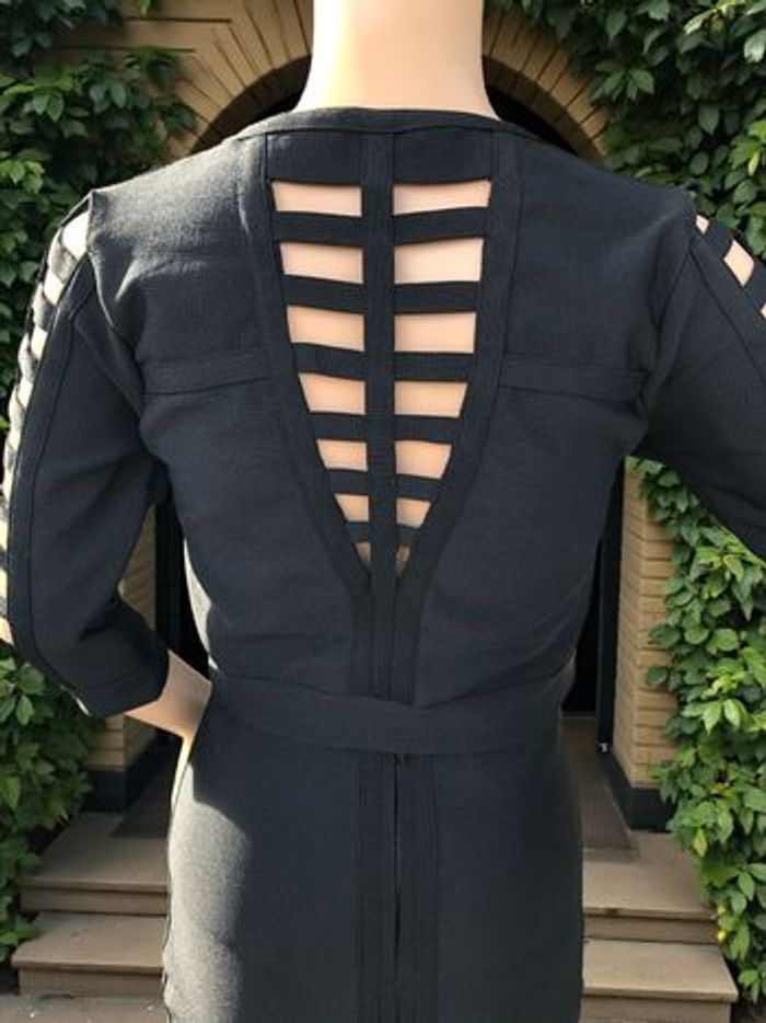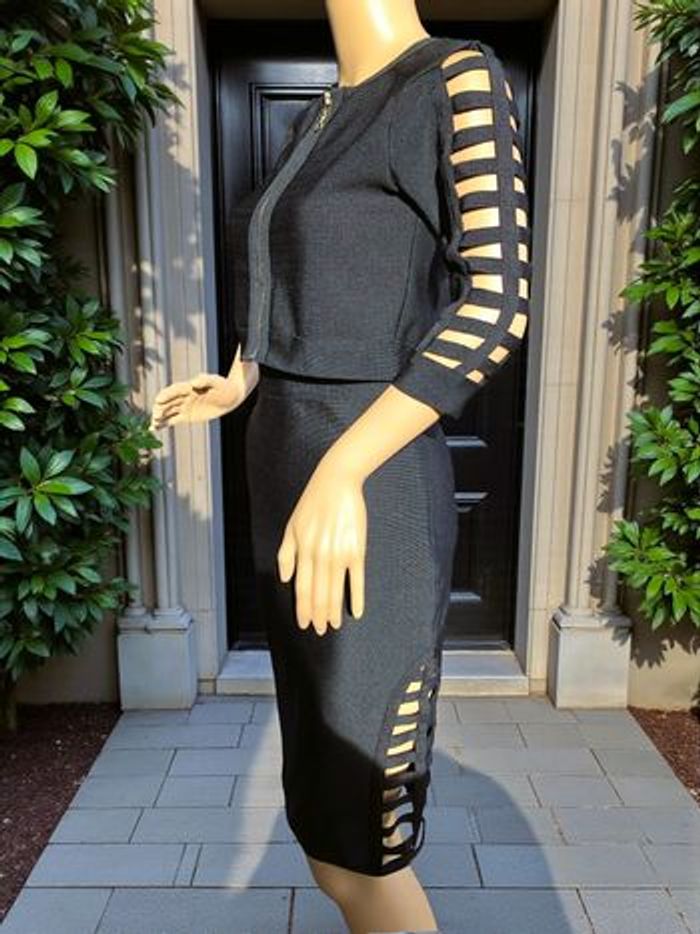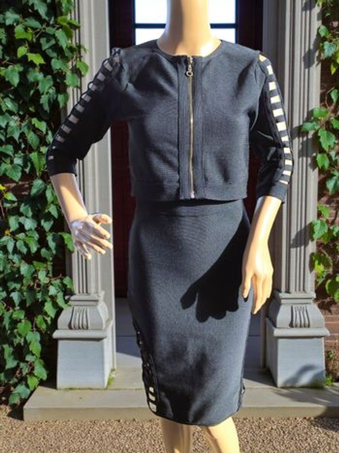 MARQUE : BONBON… ÉTAT : COMME NEUF !!! TAILLE* : 36 / S VOIR PETIT M *Taille étiquette S mais vu la matière peut convenir également à un M COLORIS : NOIR SATINÉ COMPOSITION : 90% RAYONNE + 9% NYLON + 1% SPANDEX PARTICULARITÉS : - Ensemble près du corps - Découpes grilles dos + manches veste + parties latérales de la jupe - Ajustement jupe via longue fermeture éclair invisible au dos + crochet