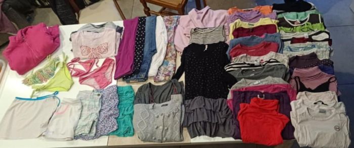 Lot 50 pièces 8 ans fille 1 veste chaude , 2 maillot de bain 2 pièces, 1 jupe de plage , 2 short 2 jupe ,1 haut pyjama. 1 ensemble pyjama, 4 pantalon/ leggings 2 gilet , 2 robe , 1 peignoir, 28 t-shirt
