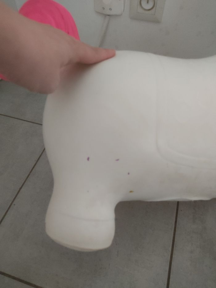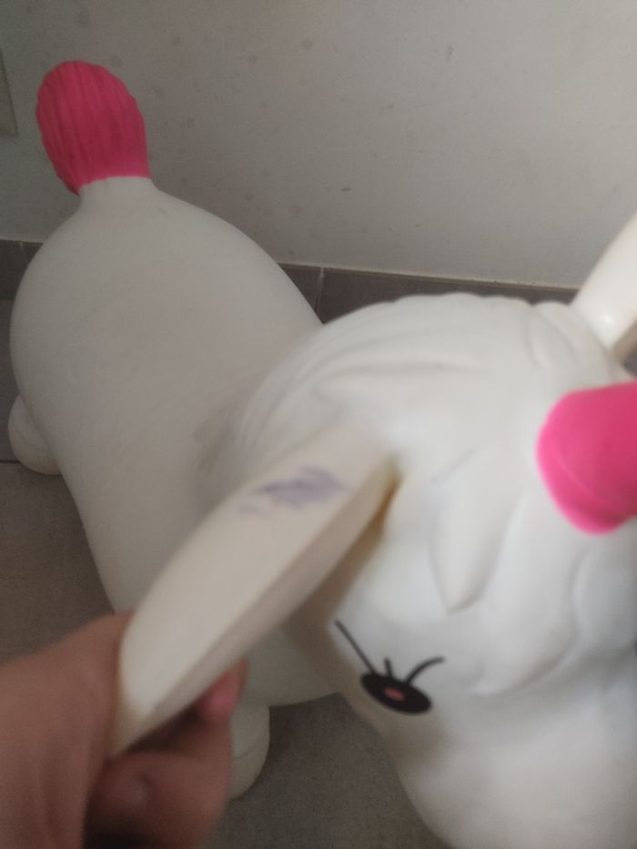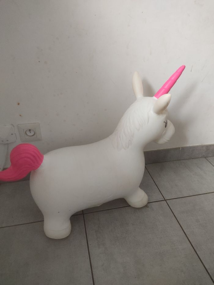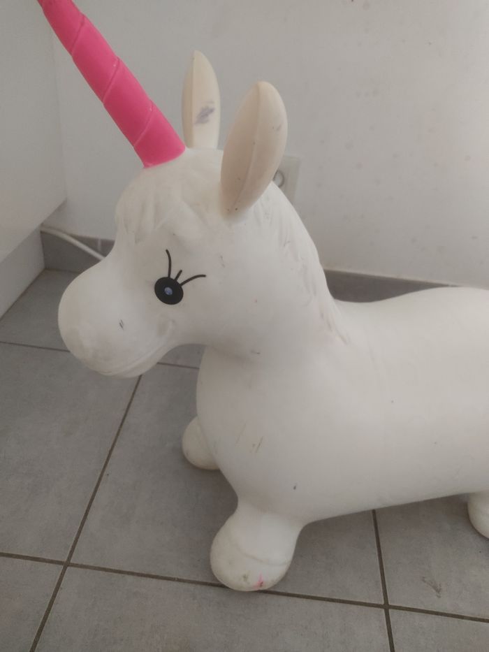 Licorne sauteuse gonflable. A été utilisée et il y a des coups de crayons à certains endroits ( voir photo). Sera dégonflée pour l'envoi.