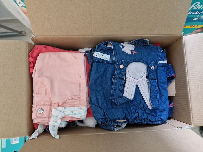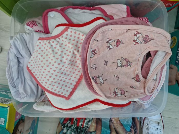 Vends vêtements bébé fille Divers marques Du Naissance au 24 mois -3 Gigoteuses -Bavoirs -1 body naissance -1 body MC 1 mois -1 carton divers chaussures -1 carton 3 mois -2 cartons 6 mois -1 carton 9 mois -3 cartons 12 mois -4 cartons 18 mois -2 cartons 24 mois Qq chaussures Petit prix (1 à 3€ par vêtement)