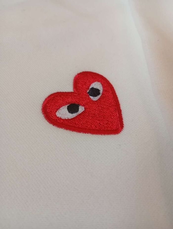 Je vends ce pull Comme Des Garçons (CDG). Produit Neuf. Type de produit: Pull Marque: Comme Des Garçons (CDG) Taille: S Couleur: Blanc Caractéristiques: Cœur de couleur rouge avec des yeux brodé N'hésitez pas à me contacter pour plus d'informations ou de photos.