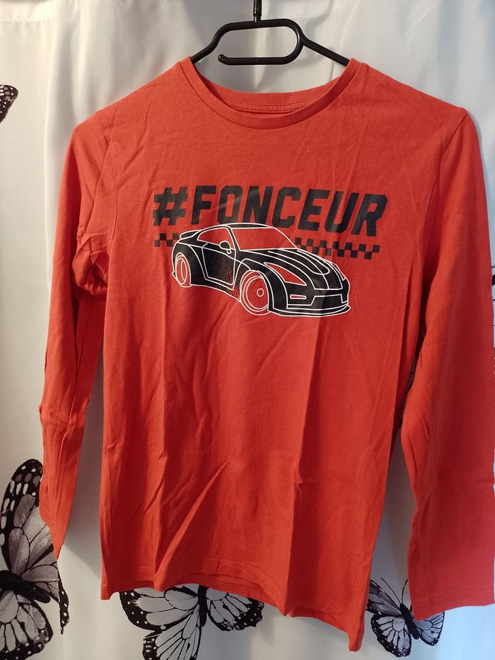 Bonjour, je vends ce tee-shirt orange pour enfant de la marque Gémo avec un motif de voiture de course