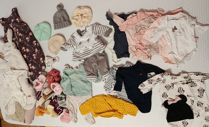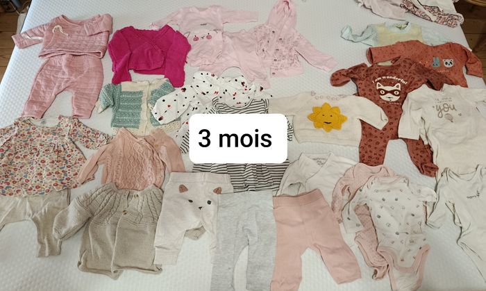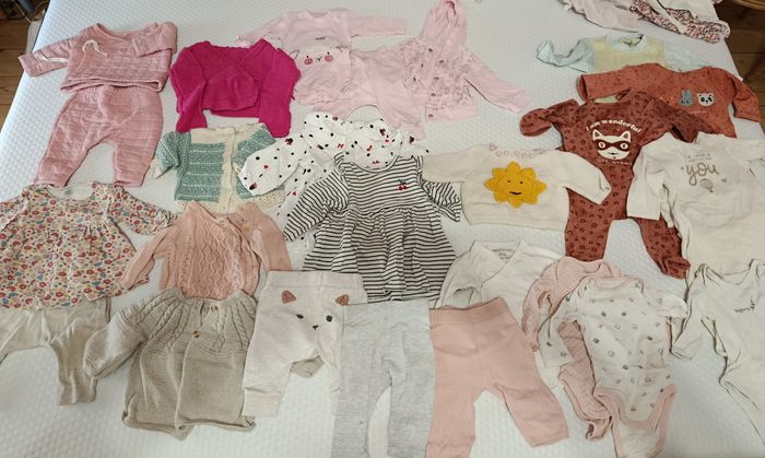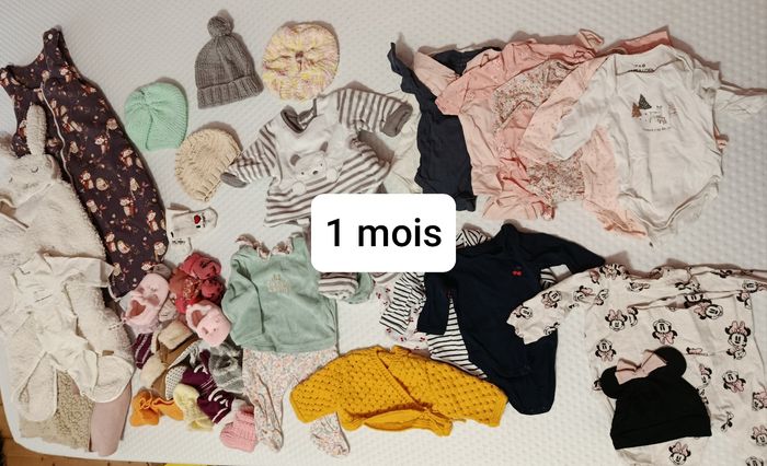 Lot taille 1 mois fille comprenant : - 10 bodies manches longues (TAO et Verbaudet) - 1 pyjama (TAO) - 1 ensemble chaud (sans marque) - 1 ensemble body + legging (h&m) - 1 gilet (fait main) - 4 bonnets (fait main) - chaussettes et chaussons Ensemble en très bon état + Lot taille 3 mois fille comprenant : - 1 ensemble Petit Bateau molletonné - 1 ensemble Petit Bateau fluide - 3 pantalons h&m et Kiabi - 5 gilets h&m et tricotes maison - 4 pyjamas velours - 2 robes h&m - 1 ensemble rose (pantalon body veste) - 4 bodies En très bon état